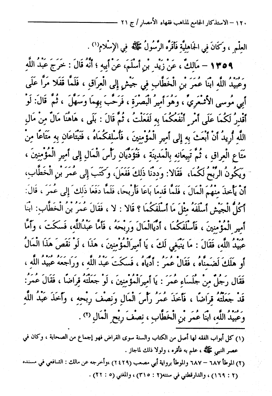 1359 - مَالِكٌ، عَنْ زَيْدِ بْنِ أَسْلَمَ، عَنْ أَبِيهِ ; أَنَّهُ قَالَ: خَرَجَ عَبْدُ اللَّهِ وَعُبَيْدُ اللَّهِ ابْنَا عُمَرَ بْنِ الْخَطَّابِ فِي جَيْشٍ إِلَى الْعِرَاقِ، فَلَمَّا قَفَلَا مَرًّا عَلَى أَبِي مُوسَى الْأَشْعَرِيِّ، وَهُوَ أَمِيرُ الْبَصْرَةِ، فَرَحَّبَ بِهِمَا وَسَهَّلَ، ثُمَّ قَالَ: لَوْ أَقْدِرُ لَكُمَا عَلَى أَمْرٍ أَنْفَعُكُمَا بِهِ لَفَعَلْتُ، ثُمَّ قَالَ: بَلَى، هَاهُنَا مَالٌ مِنْ مَالِ اللَّهِ أُرِيدُ أَنْ أَبْعَثَ بِهِ إِلَى أَمِيرِ الْمُؤْمِنِينَ، فَأُسْلِفَكُمَاهُ، فَتَبْتَاعَانِ بِهِ مَتَاعًا مِنْ مَتَاعِ الْعِرَاقِ، ثُمَّ تَبِيعَانِهِ بِالْمَدِينَةِ، فَتُؤَدِّيَانِ رَأْسَ الْمَالِ إِلَى أَمِيرِ الْمُؤْمِنِينَ وَيَكُونُ الرِّبْحُ لَكُمَا، فَقَالَا: وَدِدْنَا ذَلِكَ فَفَعَلَ، وَكَتَبَ إِلَى عُمَرَ بْنِ الْخَطَّابِ، أَنْ يَأْخُذَ مِنْهُمُ الْمَالَ، فَلَمَّا قَدِمَا بَاعَا فَأُرْبِحَا، فَلَمَّا دَفَعَا ذَلِكَ إِلَى عُمَرَ، قَالَ: أَكُلَّ الْجَيْشِ أَسْلَفَهُ مِثْلَ مَا أَسْلَفَكُمَا ؟ قَالَا: لَا فَقَالَ عُمَرُ بْنُ الْخَطَّابِ: ابْنَا أَمِيرِ الْمُؤْمِنِينَ فَأَسْلَفَكُمَا، أَدِّيَا الْمَالَ وَرَبِحَهُ، فَأَمَّا عَبْدُ اللَّهِ، فَسَكَتَ، وَأَمَّا عُبَيْدُ اللَّهِ، فَقَالَ: مَا يَنْبَغِي لَكَ يَا أَمِيرَ الْمُؤْمِنِينَ هَذَا، لَوْ نَقَصَ هَذَا الْمَالُ أَوْ هَلَكَ لَضَمِنَّاهُ، فَقَالَ عُمَرُ: أَدِّيَاهُ، فَسَكَتَ عَبْدُ اللَّهِ، وَرَاجَعَهُ عُبَيْدُ اللَّهِ، فَقَالَ رَجُلٌ مِنْ جُلَسَاءِ عُمَرَ: يَا أَمِيرَ الْمُؤْمِنِينَ، لَوْ جَعَلْتَهُ قِرَاضًا، فَقَالَ عُمَرُ: قَدْ جَعَلْتُهُ قِرَاضًا، فَأَخَذَ عُمَرُ رَأْسَ الْمَالِ وَنِصْفَ رِبْحِهِ، وَأَخَذَ عَبْدُ اللَّهِ وَعُبَيْدُ اللَّهِ، ابْنَا عُمَرَ بْنِ الْخَطَّابِ، نِصْفَ رِبْحِ الْمَالِ.