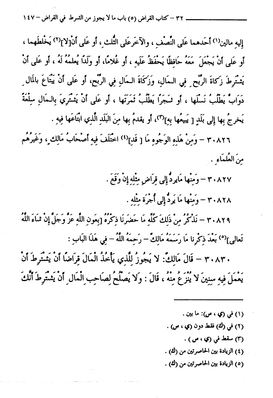 30830 - قَالَ مَالِكٌ: لَا يَجُوزُ لِلَّذِي يَأْخُذُ الْمَالَ قِرَاضًا أَنْ يَشْتَرِطَ أَنْ يَعْمَلَ فِيهِ سِنِينَ لَا يُنْزَعُ مِنْهُ، قَالَ: وَلَا يَصْلُحُ لِصَاحِبِ الْمَالِ أَنْ يَشْتَرِطَ أَنَّكَ