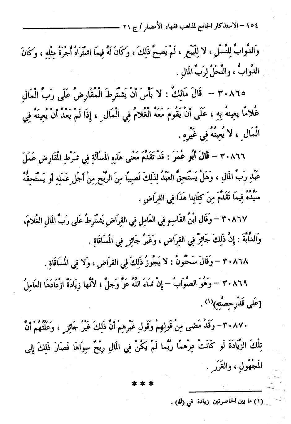 30867 - وَقَالَ ابْنُ الْقَاسِمِ فِي الْعَامِلِ فِي الْقِرَاضِ يَشْتَرِطُ عَلَى رَبِّ الْمَالِ الْغُلَامَ، وَالدَّابَّةَ: إِنَّ ذَلِكَ جَائِزٌ فِي الْقِرَاضِ، وَغَيْرُ جَائِزٍ فِي الْمُسَاقَاةِ.
