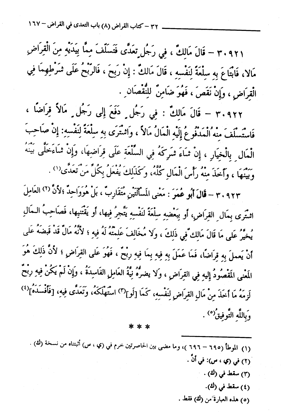 30921 - قَالَ مَالِكٌ، فِي رَجُلٍ تَعَدَّى فَتَسَلَّفَ مِمَّا بِيَدَيْهِ مِنَ الْقِرَاضِ مَالًا، فَابْتَاعَ بِهِ سِلْعَةً لِنَفْسِهِ، قَالَ مَالِكٌ: إِنْ رَبِحَ، فَالرِّبْحُ عَلَى شَرْطِهِمَا فِي الْقِرَاضِ، وَإِنْ نَقَصَ، فَهُوَ ضَامِنٌ لِلنُّقْصَانِ.