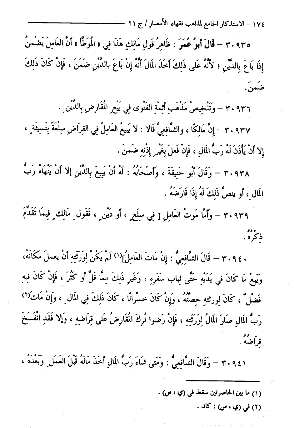 30937 - إِنَّ مَالِكًا وَالشَّافِعِيَّ قَالَا: لَا يَبِيعُ الْعَامِلُ فِي الْقِرَاضِ سِلْعَةً بِنَسِيئَةٍ إِلَّا أَنْ يَأْذَنَ لَهُ رَبُّ الْمَالِ، فَإِنْ فَعَلَ بِغَيْرِ إِذْنِهِ ضَمِنَ.