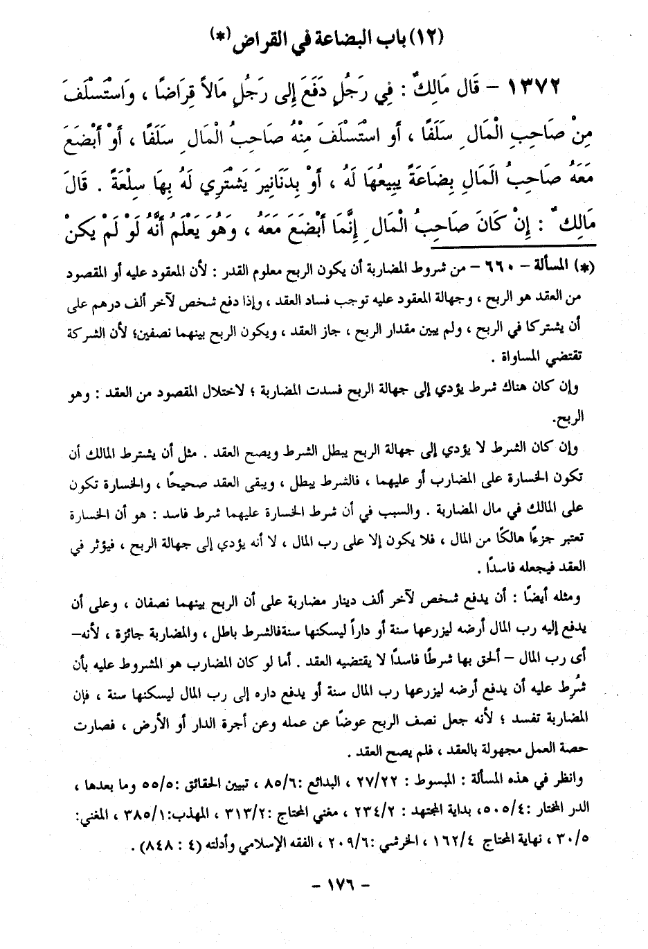 1372 - قَالَ مَالِكٌ: فِي رَجُلٍ دَفَعَ إِلَى رَجُلٍ مَالَا قِرَاضًا، وَاسْتَسْلَفَ مِنْ صَاحِبِ الْمَالِ سَلَفَا، أَوِ اسْتَسْلَفَ مِنْهُ صَاحِبُ الْمَالِ سَلَفًا، أَوْ أَبَضَعَ مَعَهُ صَاحِبُ الْمَالِ بِضَاعَةً يَبِيعُهَا لَهُ، أَوْ بِدَنَانِيرَ يَشْتَرِي لَهُ بِهَا سِلْعَةً. قَالَ مَالِكٌ: إِنْ كَانَ صَاحِبُ الْمَالِ إِنَّمَا أَبْضَعَ مَعَهُ، وَهُوَ يَعْلَمُ أَنَّهُ لَوْ لَمْ يَكُنْ