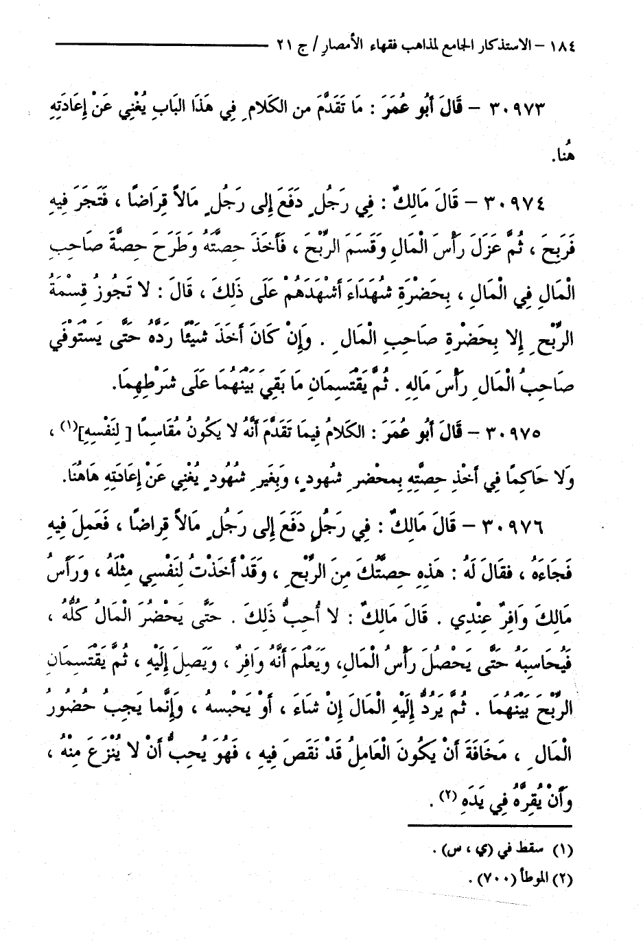 30974 - قَالَ مَالِكٌ: فِي رَجُلٍ دَفَعَ إِلَى رَجُلٍ مَالًا قِرَاضًا، فَتَجَرَ فِيهِ فَرَبِحَ، ثُمَّ عَزَلَ رَأْسَ الْمَالِ وَقَسَمَ الرِّبْحَ، فَأَخَذَ حِصَّتَهُ وَطَرَحَ حِصَّةَ صَاحِبِ الْمَالِ فِي الْمَالِ، بِحَضْرَةِ شُهَدَاءَ أَشْهَدَهُمْ عَلَى ذَلِكَ، قَالَ: لَا تَجُوزُ قِسْمَةُ الرِّبْحِ إِلَّا بِحَضْرَةِ صَاحِبِ الْمَالِ. وَإِنْ كَانَ أَخَذَ شَيْئًا رَدَّهُ حَتَّى يَسْتَوْفِيَ صَاحِبُ الْمَالِ رَأْسَ مَالِهِ، ثُمَّ يَقْتَسِمَانِ مَا بَقِيَ بَيْنَهُمَا عَلَى شَرْطِهِمَا.