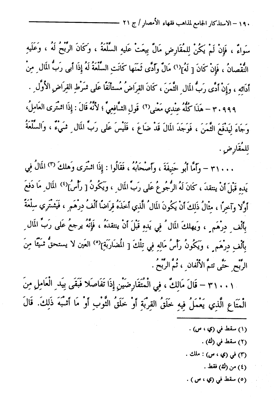 31000 - وَأَمَّا أَبُو حَنِيفَةَ، وَأَصْحَابُهُ، فَقَالُوا: إِذَا اشْتَرَى وَهَلَكَ الْمَالُ فِي يَدِهِ قَبْلَ أَنْ يَنْتَقِدَ، كَانَ لَهُ الرُّجُوعُ عَلَى رَبِّ الْمَالِ، وَيَكُونُ رَأْسُ الْمَالِ مَا دَفَعَ أَوَّلًا وَآخِرًا، مِثَالُ ذَلِكَ أَنْ يَكُونَ الْمَالُ الَّذِي أَخَذَهُ قِرَاضًا أَلْفَ دِرْهَمٍ، فَيَشْتَرِي سِلْعَةً بِأَلْفِ دِرْهَمٍ، وَيَهْلَكُ الْمَالُ فِي يَدِهِ قَبْلَ أَنْ يَنْتَقِدَهُ، فَإِنَّهُ يَرْجِعُ عَلَى رَبِّ الْمَالِ بِأَلْفِ دِرْهَمٍ، وَيَكُونُ رَأْسُ مَالِهِ فِي تِلْكَ الْمُضَارَبَةِ الْعَيْنَ لَا يَسْتَحِقُّ شَيْئًا مِنَ الرِّبْحِ حَتَّى تَتِمَّ الْأَلْفَانِ، ثُمَّ الرِّبْحُ.