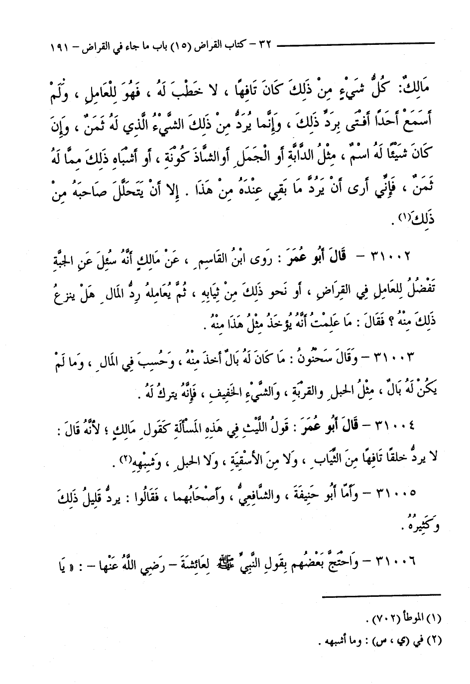31002 - قَالَ أَبُو عُمَرَ: رَوَى ابْنُ الْقَاسِمِ، عَنْ مَالِكٍ أَنَّهُ سُئِلَ عَنِ الْجُبَّةِ تَفْضُلُ لِلْعَامِلِ فِي الْقِرَاضِ، أَوْ نَحْوِ ذَلِكَ مِنْ ثِيَابِهِ، ثُمَّ يُعَامِلُهُ رَدُّ الْمَالِ هَلْ يُنْزَعُ ذَلِكَ مِنْهُ ؟ فَقَالَ: مَا عَلِمْتُ أَنَّهُ يُؤْخَذُ مِثْلُ هَذَا مِنْهُ.