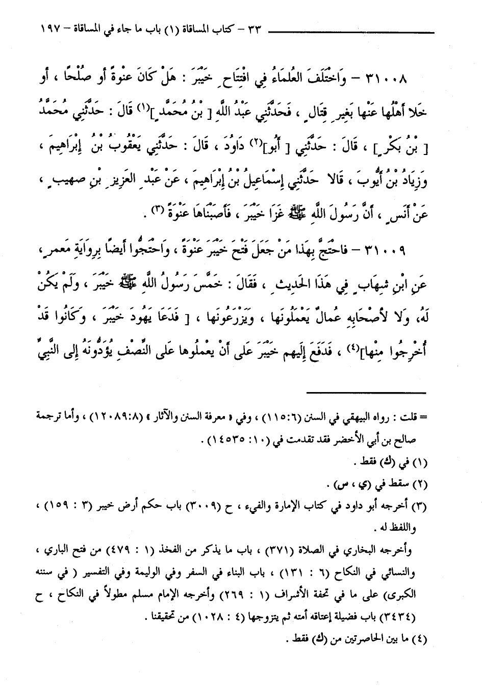 31008 - وَاخْتَلَفَ الْعُلَمَاءُ فِي افْتِتَاحِ خَيْبَرَ: هَلْ كَانَ عَنْوَةً أَوْ صُلْحًا، أَوْ خَلَا أَهْلُهَا عَنْهَا بِغَيْرِ قِتَالٍ، فَحَدَّثَنِي عَبْدُ اللَّهِ بْنُ مُحَمَّدٍ قَالَ: حَدَّثَنِي مُحَمَّدُ بْنُ بَكْرٍ، قَالَ: حَدَّثَنِي أَبُو دَاوُدَ، قَالَ: حَدَّثَنِي يَعْقُوبُ بْنُ إِبْرَاهِيمَ، وَزِيَادُ بْنُ أَيُّوبَ، قَالَا حَدَّثَنِي إِسْمَاعِيلُ بْنُ إِبْرَاهِيمَ، عَنْ عَبْدِ الْعَزِيزِ بْنِ صُهَيْبٍ، عَنْ أَنَسٍ،أَنَّ رَسُولَ اللَّهِ - صَلَّى اللَّهُ عَلَيْهِ وَسَلَّمَ - غَزَا خَيْبَرَ، فَأَصَبْنَاهَا عَنْوَةً.