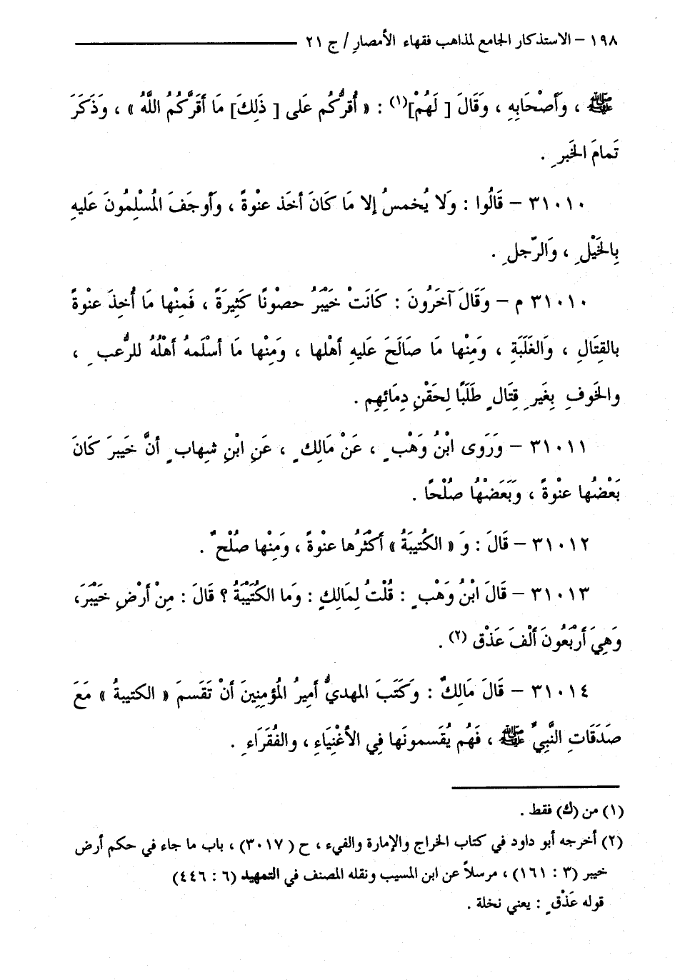 31011 - وَرَوَى ابْنُ وَهْبٍ، عَنْ مَالِكٍ، عَنِ ابْنِ شِهَابٍ أَنَّ خَيْبَرَ كَانَ بَعْضُهَا عَنْوَةً، وَبَعْضُهَا صُلْحًا.