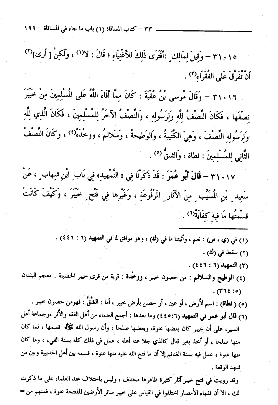 31017 - قَالَ أَبُو عُمَرَ: قَدْ ذَكَرْنَا فِي " التَّمْهِيدِ " فِي بَابِ ابْنِ شِهَابٍ، عَنْ سَعِيدِ بْنِ الْمُسَيَّبِ مِنَ الْآثَارِ الْمَرْفُوعَةِ، وَغَيْرِهَا فِي فَتْحِ خَيْبَرَ، وَكَيْفَ كَانَتْ قِسْمَتُهَا مَا فِيهِ كِفَايَةٌ.