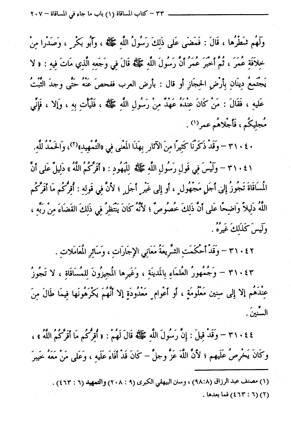 31041 - وَلَيْسَ فِي قَوْلِ رَسُولِ اللَّهِ - صَلَّى اللَّهُ عَلَيْهِ وَسَلَّمَ - لِلْيَهُودِ: " أَقَرَّكُمُ اللَّهُ " دَلِيلٌ عَلَى أَنَّ الْمُسَاقَاةَ تَجُوزُ إِلَى أَجَلٍ مَجْهُولٍ، أَوْ إِلَى غَيْرِ أَجَلٍ ; لِأَنَّ فِي قَوْلِهِ:أُقِرُّكُمْ مَا أَقَرَّكُمُ اللَّهُ دَلِيلًا وَاضِحًا عَلَى أَنَّ ذَلِكَ خُصُوصٌ ; لِأَنَّهُ كَانَ يَنْتَظِرُ فِي ذَلِكَ الْقَضَاءَ مِنْ رَبِّهِ، وَلَيْسَ كَذَلِكَ غَيْرُهُ.