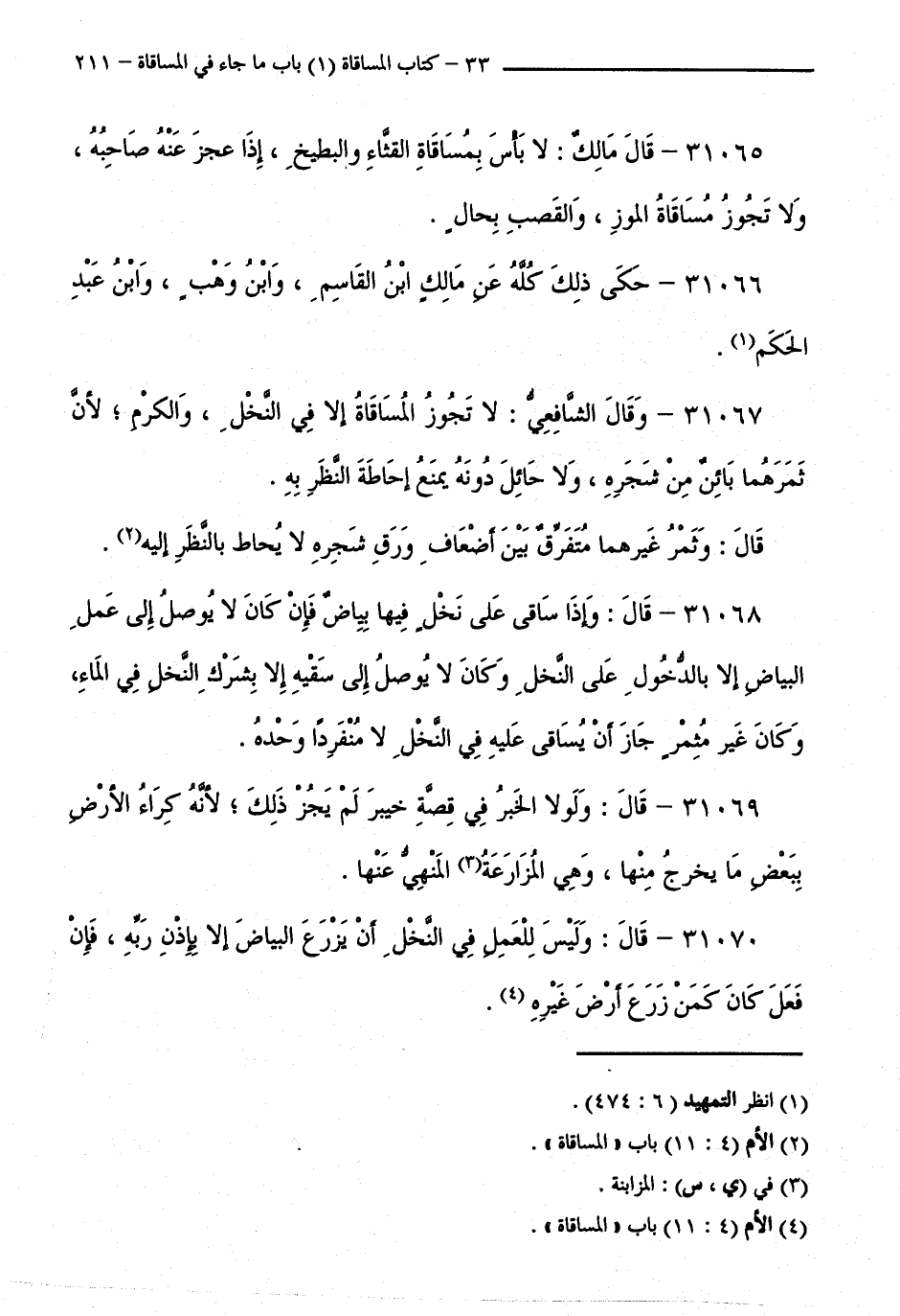31065 - قَالَ مَالِكٌ: لَا بَأْسَ بِمُسَاقَاةِ الْقِثَّاءِ وَالْبِطِّيخِ، إِذَا عَجَزَ عَنْهُ صَاحِبُهُ، وَلَا تَجُوزُ مُسَاقَاةُ الْمَوْزِ، وَالْقَصَبِ بِحَالٍ.