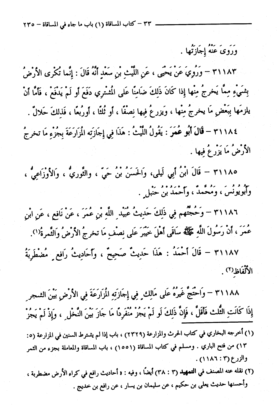 31184 - قَالَ أَبُو عُمَرَ: يَقُولُ اللَّيْثُ: هَذَا فِي إِجَازَتِهِ الْمُزَارَعَةَ بِجُزْءِ مَا تُخْرِجُ الْأَرْضُ مَا يُزْرَعُ فِيهَا.