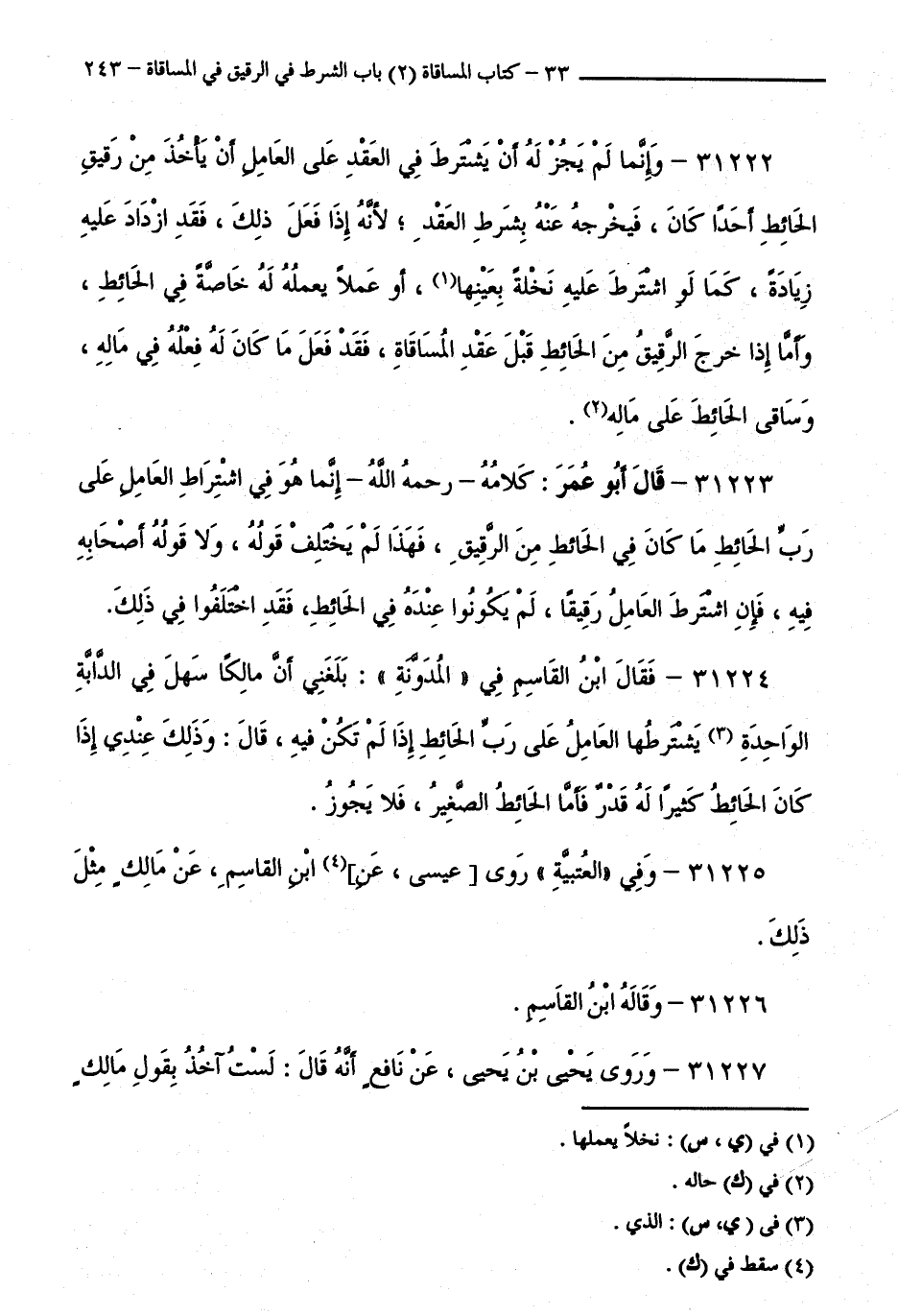 31223 - قَالَ أَبُو عُمَرَ: كَلَامُهُ - رَحِمَهُ اللَّهُ - إِنَّمَا هُوَ فِي اشْتِرَاطِ الْعَامِلِ عَلَى رَبِّ الْحَائِطِ مَا كَانَ فِي الْحَائِطِ مِنَ الرَّقِيقِ، فَهَذَا لَمْ يَخْتَلِفْ قَوْلُهُ، وَلَا قَوْلُ أَصْحَابِهِ فِيهِ، فَإِنِ اشْتَرَطَ الْعَامِلُ رَقِيقًا، لَمْ يَكُونُوا عِنْدَهُ فِي الْحَائِطِ، فَقَدِ اخْتَلَفُوا فِي ذَلِكَ.