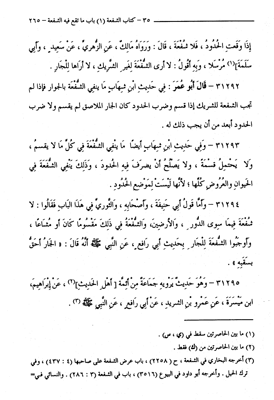 31293 - فِي حَدِيثِ ابْنِ شِهَابٍ مَا يَنْفِي الشُّفْعَةَ فِي كُلِّ مَا لَا يُقْسَمُ، وَلَا يَحْتَمِلُ قِسْمَةً، وَلَا يَصْلُحُ أَنْ يُصْرَفَ فِيهِ الْحُدُودُ، وَذَلِكَ يَنْفِي الشُّفْعَةَ فِي الْحَيَوَانِ وَالْعُرُوضِ كُلِّهَا ; لِأَنَّهَا لَيْسَتْ لِمَوْضِعِ الْحُدُودِ.