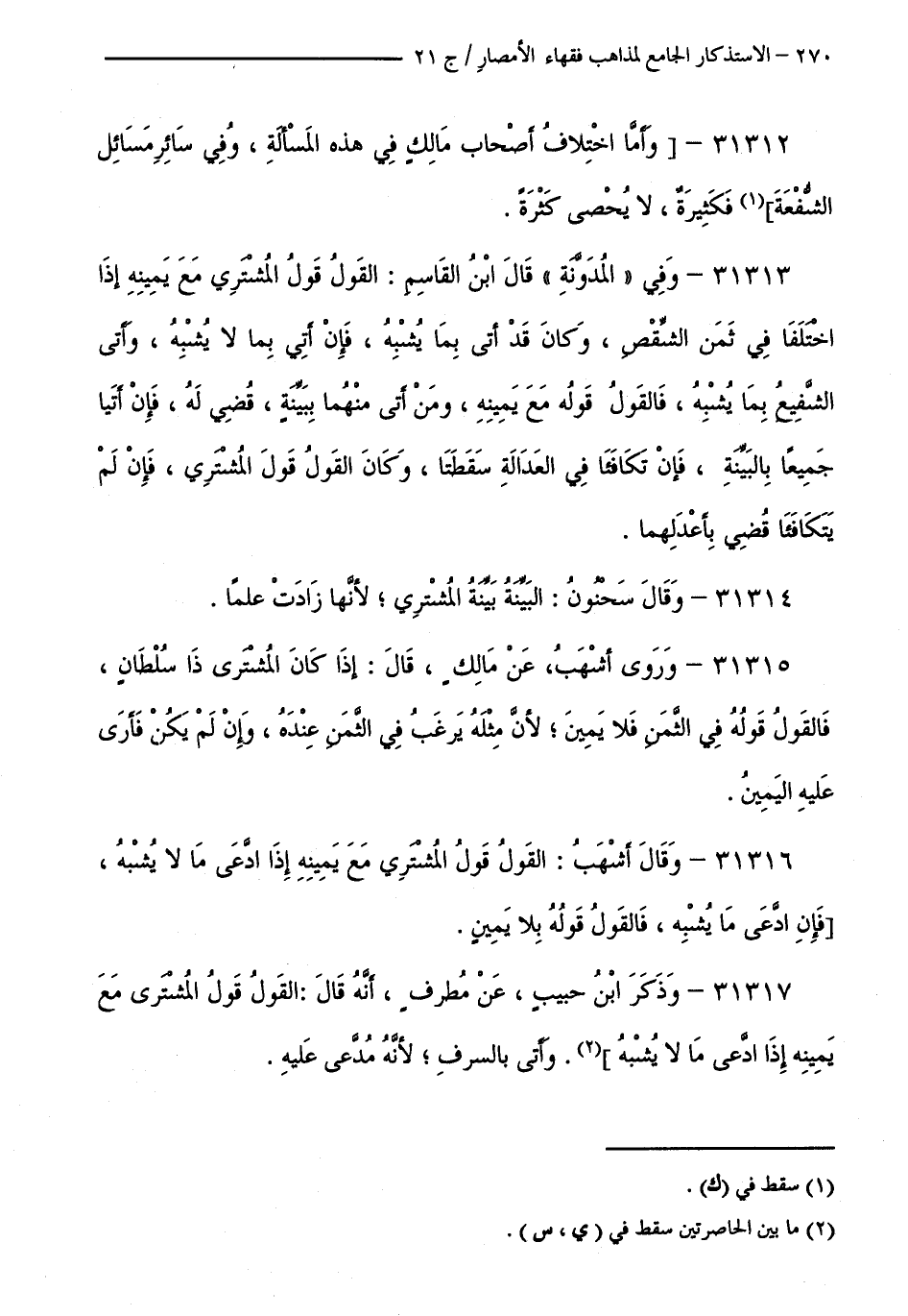 31316 - وَقَالَ أَشْهَبُ: الْقَوْلُ قَوْلُ الْمُشْتَرِي مَعَ يَمِينِهِ إِذَا ادَّعَى مَا لَا يُشْبِهُ، فَإِنِ ادَّعَى مَا يُشْبِهُ، فَالْقَوْلُ قَوْلُهُ بِلَا يَمِينٍ.