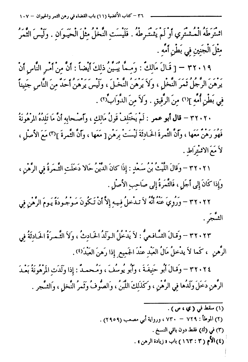 32019 - قَالَ مَالِكٌ: وَمِمَّا يُبَيِّنُ ذَلِكَ أَيْضًا: أَنَّ مِنْ أَمْرِ النَّاسِ أَنْ يَرْهَنَ الرَّجُلُ ثَمَرَ النَّخْلِ، وَلَا يَرْهَنُ النَّخْلَ، وَلَيْسَ يَرْهَنُ أَحَدٌ مِنَ النَّاسِ جَنِينًا فِي بَطْنِ أُمِّهِ مِنَ الرَّقِيقِ. وَلَا مِنَ الدَّوَابِّ.