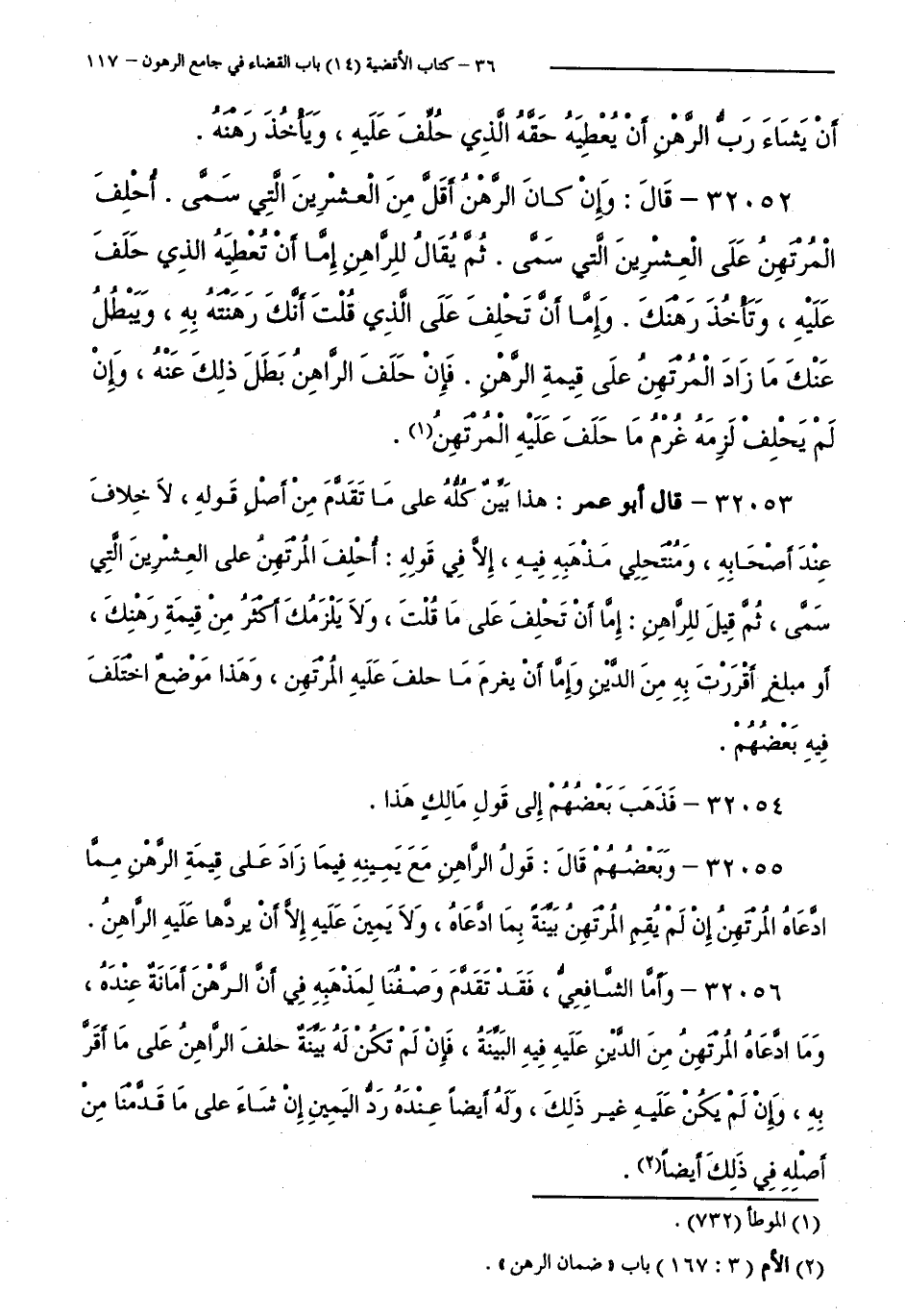 32052 - قَالَ: وَإِنْ كَانَ الرَّهْنُ أَقَلَّ مِنَ الْعِشْرِينَ الَّتِي سَمَّى. أُحْلِفَ الْمُرْتَهِنُ عَلَى الْعِشْرِينَ الَّتِي سَمَّى. ثُمَّ يُقَالُ لِلرَّاهِنِ إِمَّا أَنْ تُعْطِيَهُ الَّذِي حَلَفَ عَلَيْهِ، وَتَأْخُذَ رَهْنَكَ. وَإِمَّا أَنْ تَحْلِفَ عَلَى الَّذِي قُلْتَ إِنَّكَ رَهَنْتَهُ بِهِ، وَيَبْطُلُ عَنْكَ مَا زَادَ الْمُرْتَهِنُ عَلَى قِيمَةِ الرَّهْنِ. فَإِنْ حَلَفَ الرَّاهِنُ بَطَلَ ذَلِكَ عَنْهُ، وَإِنْ لَمْ يَحْلِفْ لَزِمَهُ غُرْمُ مَا حَلَفَ عَلَيْهِ الْمُرْتَهِنُ.