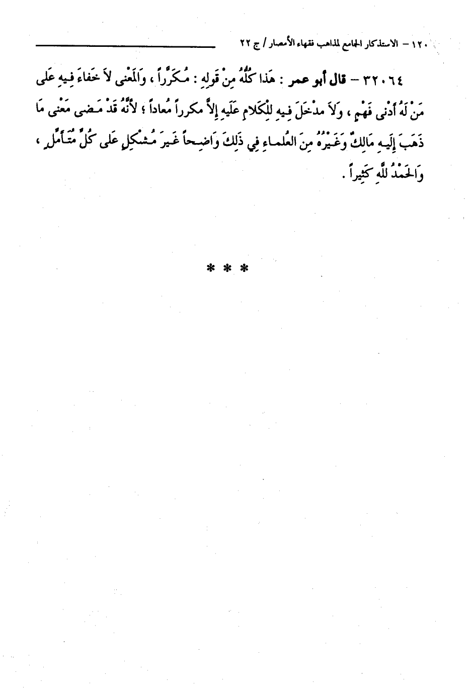 32064 - قَالَ أَبُو عُمَرَ: هَذَا كُلُّهُ مِنْ قَوْلِهِ: مُكَرَّرًا، وَالْمَعْنَى لَا خَفَاءَ فِيهِ عَلَى مَنْ لَهُ أَدْنَى فَهْمٌ، وَلَا مَدْخَلَ فِيهِ لِلْكَلَامِ عَلَيْهِ إِلَّا مُكَرَّرًا مُعَادًا; لِأَنَّهُ قَدْ مَضَى مَعْنَى مَا ذَهَبَ إِلَيْهِ مَالِكٌ وَغَيْرُهُ مِنَ الْعُلَمَاءِ فِي ذَلِكَ وَاضِحًا غَيْرَ مُشْكِلٍ عَلَى كُلِّ مُتَأَمِّلٍ، وَالْحَمْدُ لِلَّهِ كَثِيرًا.