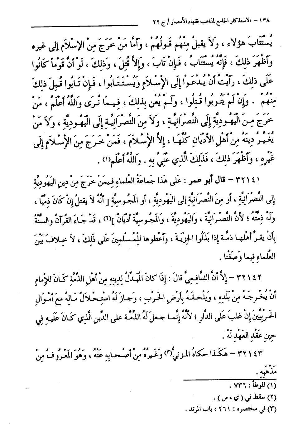 32141 - قَالَ أَبُو عُمَرَ: عَلَى هَذَا جَمَاعَةُ الْعُلَمَاءِ فِيمَنْ خَرَجَ مِنْ دِينِ الْيَهُودِيَّةِ إِلَى النَّصْرَانِيَّةِ، أَوْ مِنَ النَّصْرَانِيَّةِ إِلَى الْيَهُودِيَّةِ، أَوِ الْمَجُوسِيَّةِ أَنَّهُ لَا يُقْتَلُ إِنْ كَانَ ذِمِّيًّا، وَلَهُ ذِمَّتُهُ; لِأَنَّ النَّصْرَانِيَّةَ، وَالْيَهُودِيَّةَ، وَالْمَجُوسِيَّةَ أَدْيَانٌ، قَدْ جَاءَ الْقُرْآنُ وَالسُّنَّةُ بِأَنْ يُقَرَّ أَهْلُهَا ذِمَّةً إِذَا بَذَلُوا الْجِزْيَةَ، وَأَعْطَوْهَا لِلْمُسْلِمِينَ عَلَى ذَلِكَ، لَا خِلَافَ بَيْنِ الْعُلَمَاءِ فِيمَا وَصَفْنَا.