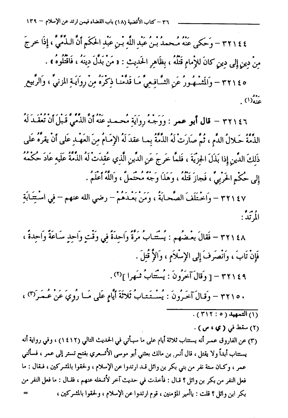 32147 - وَاخْتَلَفَ الصَّحَابَةُ، وَمَنْ بَعْدَهُمْ - رَضِيَ اللَّهُ عَنْهُمْ - فِي اسْتِتَابَةِ الْمُرْتَدِّ: