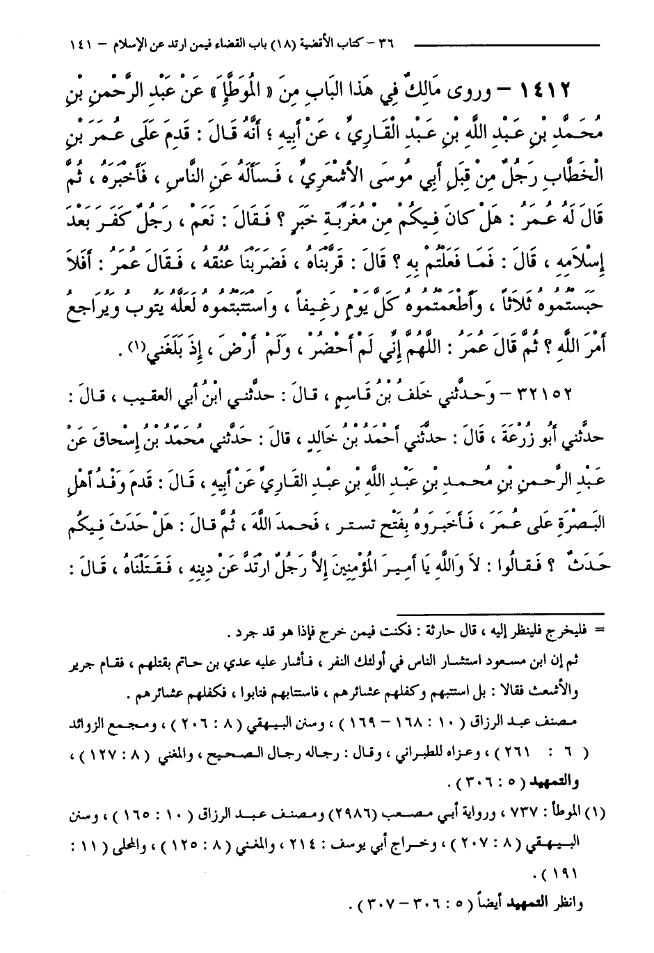 1412 - وَرَوَى مَالِكٌ فِي هَذَا الْبَابِ مِنَ الْمُوَطَّأِ عَنْ عَبْدِ الرَّحْمَنِ بْنِ مُحَمَّدِ بْنِ عَبْدِ اللَّهِ بْنِ عَبْدٍ الْقَارِيِّ، عَنْ أَبِيهِ ; أَنَّهُ قَالَ: قَدِمَ عَلَى عُمَرَ بْنِ الْخَطَّابِ رَجُلٌ مِنْ قِبَلِ أَبِي مُوسَى الْأَشْعَرِيِّ، فَسَأَلَهُ عَنِ النَّاسِ، فَأَخْبَرَهُ، ثُمَّ قَالَ لَهُ عُمَرُ: هَلْ كَانَ فِيكُمْ مِنْ مُغَرِّبَةٍ خَبَرٌ ؟ فَقَالَ: نَعَمْ، رَجُلٌ كَفَرَ بَعْدَ إِسْلَامِهِ، قَالَ: فَمَا فَعَلْتُمْ بِهِ ؟ قَالَ: قَرَّبْنَاهُ، فَضَرَبْنَا عُنُقَهُ، فَقَالَ عُمَرُ: أَفَلَا حَبَسْتُمُوهُ ثَلَاثًا، وَأَطْعَمْتُمُوهُ كُلَّ يَوْمٍ رَغِيفًا، وَاسْتَتَبْتُمُوهُ لَعَلَّهُ يَتُوبُ وَيُرَاجِعُ أَمْرَ اللَّهِ ؟ ثُمَّ قَالَ عُمَرُ: اللَّهُمَّ إِنِّي لَمْ أَحْضُرْ، وَلَمْ أَرْضَ إِذْ بَلَغَنِي.