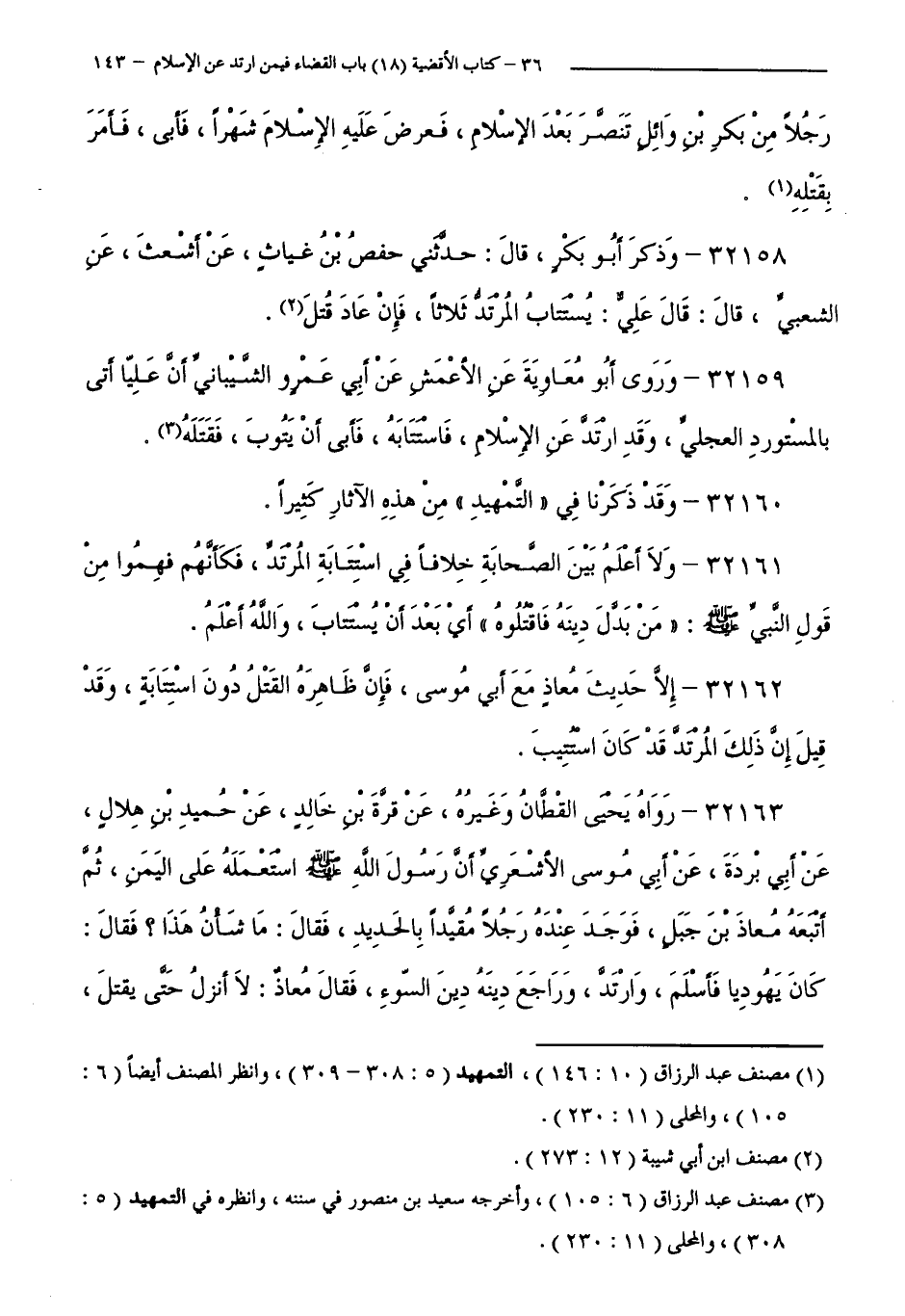 32158 - وَذَكَرَ أَبُو بَكْرٍ، قَالَ: حَدَّثَنِي حَفْصُ بْنُ غِيَاثٍ، عَنْ أَشْعَثَ، عَنِ الشَّعْبِيِّ، قَالَ: قَالَ عَلِيٌّ: يُسْتَتَابُ الْمُرْتَدُّ ثَلَاثًا، فَإِنْ عَادَ قُتِلَ.