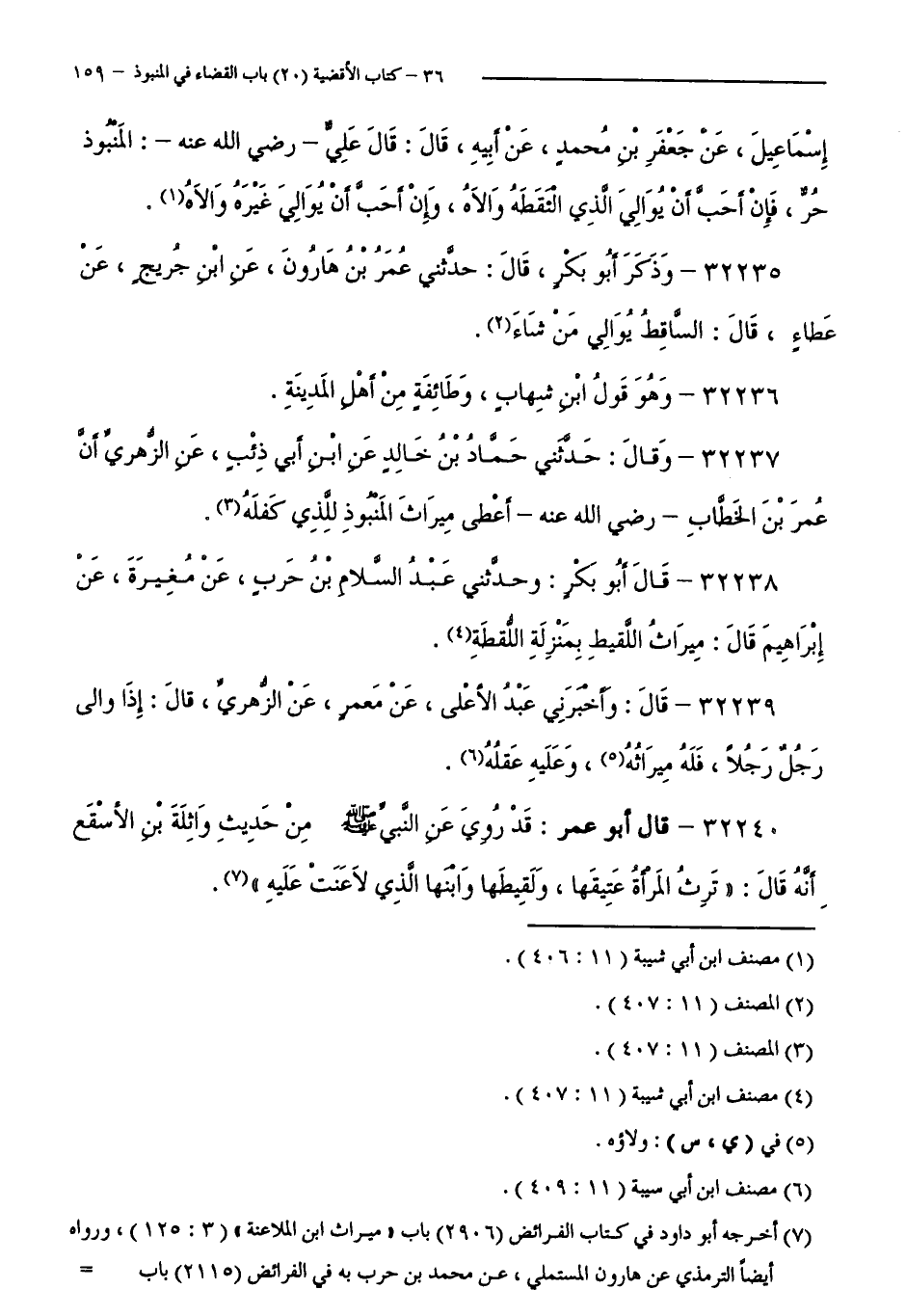 32237 - وَقَالَ: حَدَّثَنِي حَمَّادُ بْنُ خَالِدٍ عَنِ ابْنِ أَبِي ذِئْبٍ، عَنِ الزُّهْرِيِّ أَنَّ عُمَرَ بْنَ الْخَطَّابِ - رَضِيَ اللَّهُ عَنْهُ - أَعْطَى مِيرَاثَ الْمَنْبُوذِ لِلَّذِي كَفَلَهُ.