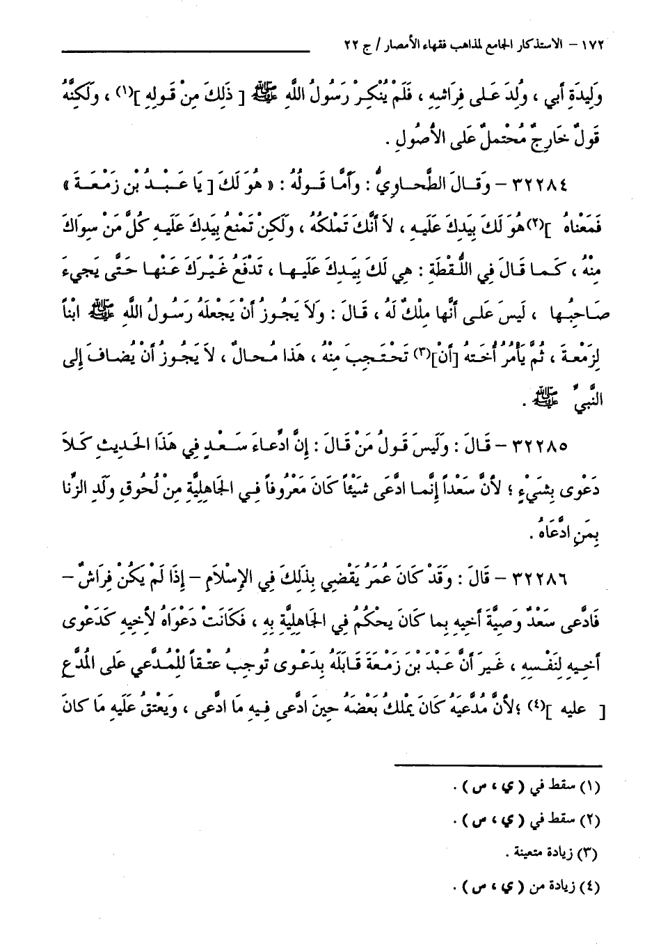 32286 - قَالَ وَقَدْ كَانَ عُمَرُ يَقْضِي بِذَلِكَ فِي الْإِسْلَامِ - إِذَا لَمْ يَكُنْ فِرَاشٌ - فَادَّعَى سَعْدٌ وَصِيَّةَ أَخِيهِ بِمَا كَانَ يَحْكُمُ فِي الْجَاهِلِيَّةِ بِهِ، فَكَانَتْ دَعْوَاهُ لِأَخِيهِ كَدَعْوَى أَخِيهِ لِنَفْسِهِ، غَيْرَ أَنَّ عَبْدَ بْنَ زَمْعَةَ قَابَلَهُ بِدَعْوَى تُوجِبُ عِتْقًا لِلْمُدَّعِي عَلَى الْمُدَّعَى عَلَيْهِ ; لِأَنَّ مُدَّعِيَهُ كَانَ يَمْلِكُ بَعْضَهُ حِينَ ادَّعَى فِيهِ مَا ادَّعَى، وَيُعْتِقُ عَلَيْهِ مَا كَانَ