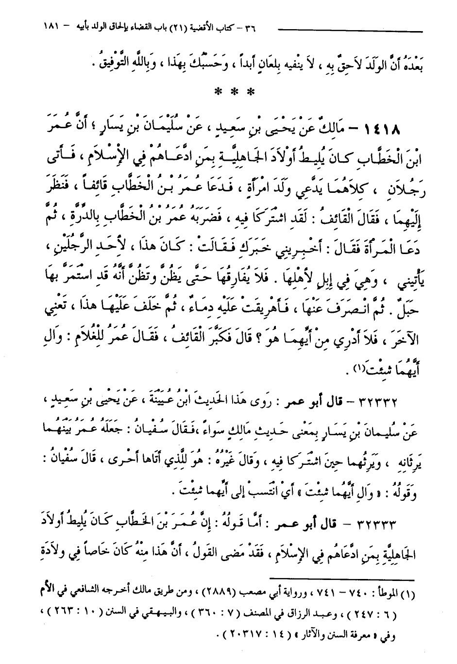 1418 - مَالِكٌ عَنْ يَحْيَى بْنِ سَعِيدٍ، عَنْ سُلَيْمَانَ بْنِ يَسَارٍ ; أَنَّ عُمَرَ بْنَ الْخَطَّابِ كَانَ يُلِيطُ أَوْلَادَ الْجَاهِلِيَّةِ بِمَنِ ادَّعَاهُمْ فِي الْإِسْلَامِ، فَأَتَى رَجُلَانِ، كِلَاهُمَا يَدَّعِي وَلَدَ امْرَأَةٍ، فَدَعَا عُمَرُ بْنُ الْخَطَّابِ قَائِفًا، فَنَظَرَ إِلَيْهِمَا، فَقَالَ الْقَائِفُ: لَقَدِ اشْتَرَكَا فِيهِ، فَضَرَبَهُ عُمَرُ بْنُ الْخَطَّابِ بِالدِّرَّةِ، ثُمَّ دَعَا الْمَرْأَةَ فَقَالَ: أَخْبِرِينِي خَبَرَكِ فَقَالَتْ: كَانَ هَذَا - لِأَحَدِ الرَّجُلَيْنِ - يَأْتِينِي، وَهِيَ فِي إِبِلٍ لِأَهْلِهَا. فَلَا يُفَارِقُهَا حَتَّى يَظُنَّ وَتَظُنَّ أَنَّهُ قَدِ اسْتَمَرَّ بِهَا حَبَلٌ. ثُمَّ انْصَرَفَ عَنْهَا، فَأُهْرِيقَتْ عَلَيْهِ دِمَاءٌ، ثُمَّ خَلَفَ عَلَيْهَا هَذَا، تَعْنِي الْآخَرَ، فَلَا أَدْرِي مِنْ أَيِّهِمَا هُوَ ؟ قَالَ فَكَبَّرَ الْقَائِفُ، فَقَالَ عُمَرُ لِلْغُلَامِ: وَالِ أَيَّهُمَا شِئْتَ.