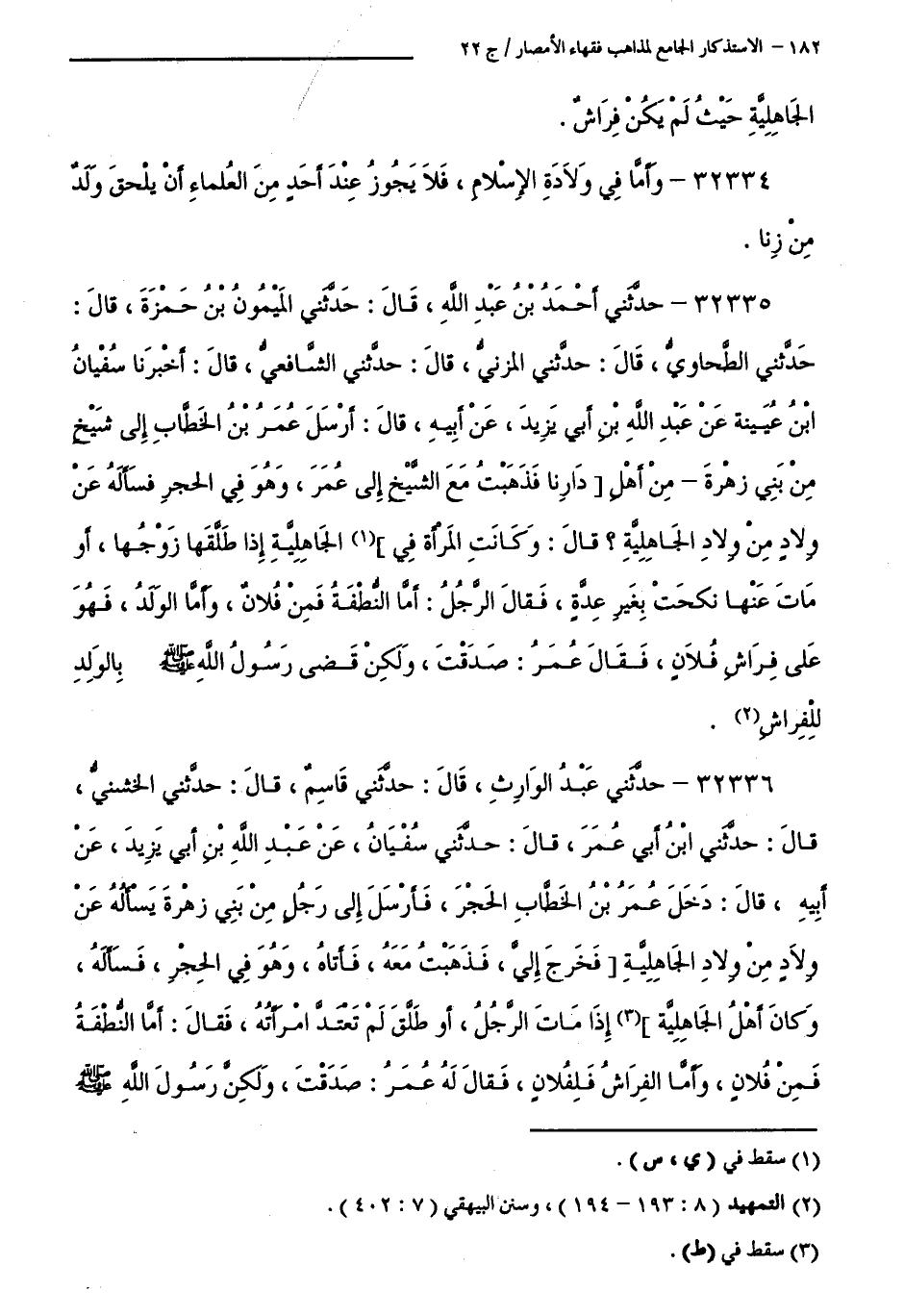 32335 - حَدَّثَنِي أَحْمَدُ بْنُ عَبْدِ اللَّهِ، قَالَ: حَدَّثَنِي الْمَيْمُونُ بْنُ حَمْزَةَ، قَالَ: حَدَّثَنِي الطَّحَاوِيُّ، قَالَ: حَدَّثَنِي الْمُزَنِيُّ، قَالَ: حَدَّثَنِي الشَّافِعِيُّ، قَالَ: أَخْبَرَنَا سُفْيَانُ بْنُ عُيَيْنَةَ عَنْ عَبْدِ اللَّهِ بْنِ أَبِي يَزِيدَ، عَنْ أَبِيهِ، قَالَ:أَرْسَلَ عُمَرُ بْنُ الْخَطَّابِ إِلَى شَيْخٍ مَنْ بَنِي زُهْرَةَ - مِنْ أَهْلِ دَارِنَا فَذَهَبْتُ مَعَ الشَّيْخِ إِلَى عُمَرَ، وَهُوَ فِي الْحِجْرِ فَسَأَلَهُ عَنْ وِلَادٍ مِنْ وِلَادِ الْجَاهِلِيَّةِ ؟ قَالَ: وَكَانَتِ الْمَرْأَةُ فِي الْجَاهِلِيَّةِ إِذَا طَلَّقَهَا زَوْجُهَا، أَوْ مَاتَ عَنْهَا نُكِحَتْ بِغَيْرِ عِدَّةٍ، فَقَالَ الرَّجُلُ: أَمَّا النُّطْفَةُ فَمِنْ فُلَانٍ، وَأَمَّا الْوَلَدُ، فَهُوَ عَلَى فِرَاشِ فُلَانٍ، فَقَالَ عُمَرُ: صَدَقْتَ، وَلَكِنْ قَضَى رَسُولُ اللَّهِ - صَلَّى اللَّهُ عَلَيْهِ وَسَلَّمَ - بِالْوَلَدِ لِلْفِرَاشِ.