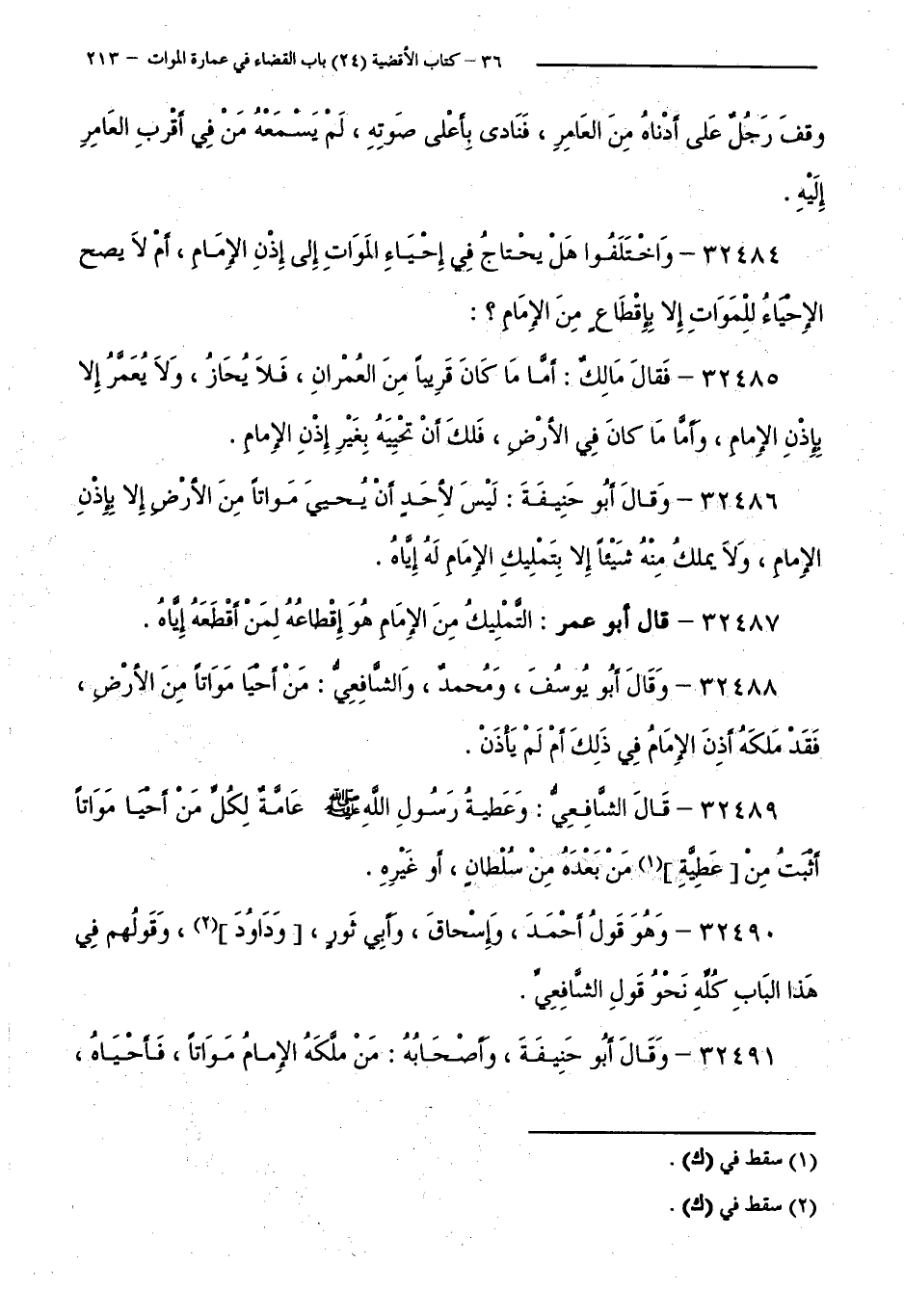 32488 - وَقَالَ أَبُو يُوسُفَ، وَمُحَمَّدٌ، وَالشَّافِعِيُّ: مَنْ أَحْيَا مَوَاتًا مِنَ الْأَرْضِ، فَقَدْ مَلَكَهُ، أَذِنَ الْإِمَامُ فِي ذَلِكَ أَمْ لَمْ يَأْذَنْ.