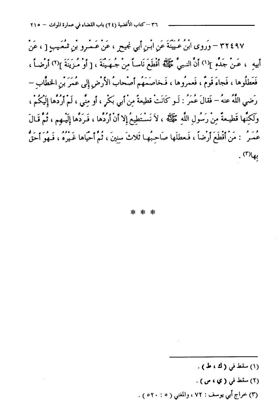 32497 - وَرَوَى ابْنُ عُيَيْنَةَ عَنِ ابْنِ أَبِي نَجِيحٍ، عَنْ عَمْرِو بْنِ شُعَيْبٍ، عَنْ أَبِيهِ، عَنْ جَدِّهِ أَنَّ النَّبِيَّ - صَلَّى اللَّهُ عَلَيْهِ وَسَلَّمَ - أَقْطَعَ نَاسًا مِنْ جُهَيْنَةَ، أَوْ مُزَيْنَةَ أَرْضًا، فَعَطَّلُوهَا، فَجَاءَ قَوْمٌ فَعَمَّرُوهَا، فَخَاصَمَهُمْ أَصْحَابُ الْأَرْضِ إِلَى عُمَرَ بْنِ الْخَطَّابِ - رَضِيَ اللَّهُ عَنْهُ - فَقَالَ عُمَرُ: لَوْ كَانَتْ قَطِيعَةً مِنْ أَبِي بَكْرٍ، أَوْ مِنِّي، لَمْ أَرُدَّهَا إِلَيْكُمْ، وَلَكِنَّهَا قَطِيعَةٌ مِنْ رَسُولِ اللَّهِ - صَلَّى اللَّهُ عَلَيْهِ وَسَلَّمَ -، لَا نَسْتَطِيعُ إِلَّا أَنْ أَرُدَّهَا، فَرَدَّهَا إِلَيْهِمْ، ثُمَّ قَالَ عُمَرُ: مَنْ أَقْطَعَ أَرْضًا، فَعَطَّلَهَا صَاحِبُهَا ثَلَاثَ سِنِينَ، ثُمَّ أَحْيَاهَا غَيْرُهُ، فَهُوَ أَحَقُّ بِهَا.