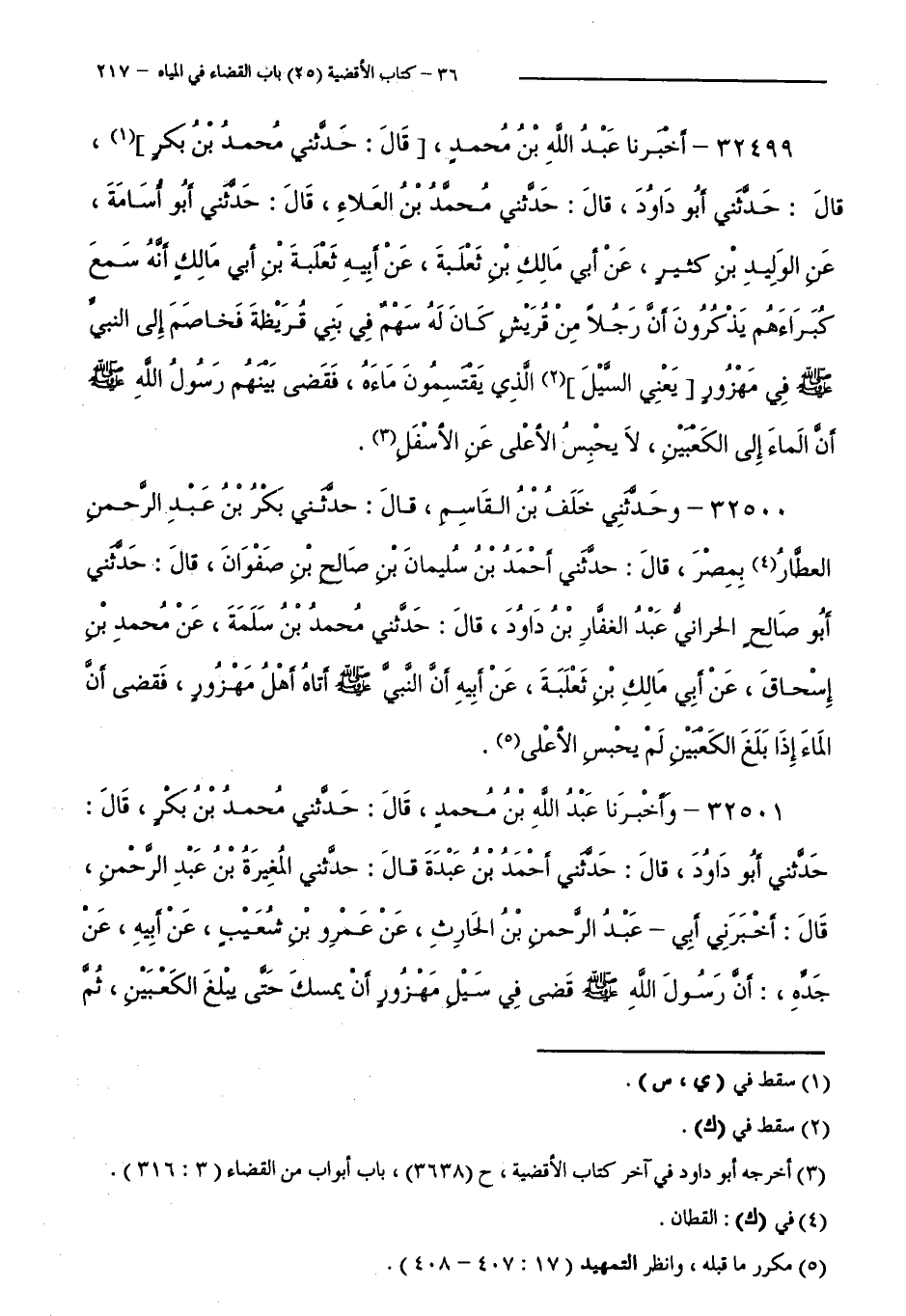 32499 - أَخْبَرَنَا عَبْدُ اللَّهِ بْنُ مُحَمَّدٍ، قَالَ: حَدَّثَنِي مُحَمَّدُ بْنُ بَكْرٍ، قَالَ حَدَّثَنِي أَبُو دَاوُدَ، قَالَ: حَدَّثَنِي مُحَمَّدُ بْنُ الْعَلَاءِ، قَالَ: حَدَّثَنِي أَبُو أُسَامَةَ، عَنِ الْوَلِيدِ بْنِ كَثِيرٍ، عَنْ أَبِي مَالِكِ بْنِ ثَعْلَبَةَ، عَنْ أَبِيهِ ثَعْلَبَةَ بْنِ أَبِي مَالِكٍ أَنَّهُ سَمِعَ كُبَرَاءَهُمْ يَذْكُرُونَأَنَّ رَجُلًا مِنْ قُرَيْشٍ كَانَ لَهُ سَهْمٌ فِي بَنِي قُرَيْظَةَ فَخَاصَمَ إِلَى النَّبِيِّ - صَلَّى اللَّهُ عَلَيْهِ وَسَلَّمَ - فِي مَهْزُورٍ يَعْنِي السَّيْلَ الَّذِي يَقْتَسِمُونَ مَاءَهُ، فَقَضَى بَيْنَهُمْ رَسُولُ اللَّهِ - صَلَّى اللَّهُ عَلَيْهِ وَسَلَّمَ - أَنَّ الْمَاءَ إِلَى الْكَعْبَيْنِ، لَا يَحْبِسُ الْأَعْلَى عَنِ الْأَسْفَلِ.