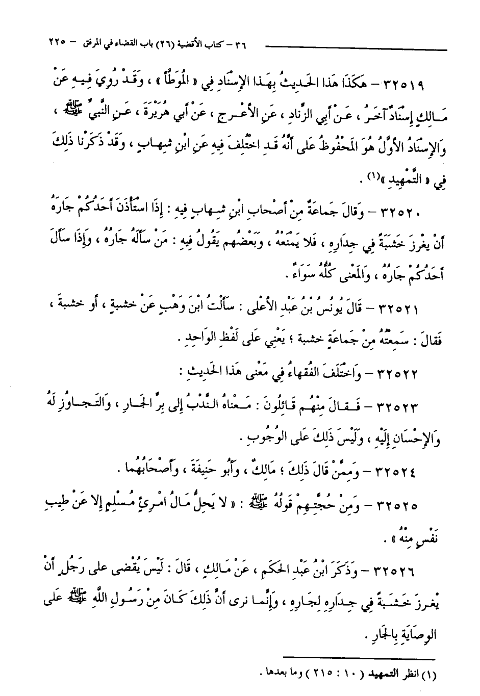 32526 - وَذَكَرَ ابْنُ عَبْدِ الْحَكَمِ، عَنْ مَالِكٍ، قَالَ: لَيْسَ يُقْضَى عَلَى رَجُلٍ أَنْ يَغْرِزَ خَشَبَةً فِي جِدَارِهِ لِجَارِهِ، وَإِنَّمَا نَرَى أَنَّ ذَلِكَ كَانَ مِنْ رَسُولِ اللَّهِ - صَلَّى اللَّهُ عَلَيْهِ وَسَلَّمَ - عَلَى الْوِصَايَةِ بِالْجَارِ.