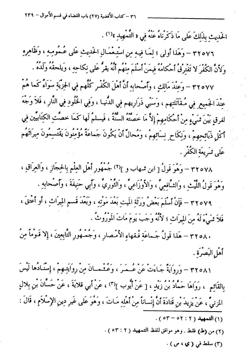 32577 - وَعِنْدَ مَالِكٍ، وَأَصْحَابِهِ أَنَّ أَهْلَ الْكُفْرِ كُلَّهُمْ فِي الْجِزْيَةِ سَوَاءٌ كَمَا هُمْ عِنْدَ الْجَمِيعِ فِي مُقَاتَلَتِهِمْ، وَسَبْيِ ذَرَارِيهِمْ فِي الدُّنْيَا، وَفِي الْخُلُودِ فِي النَّارِ، فَلَا وَجْهَ لِفَرْقٍ بَيْنَ شَيْءٍ مِنْ أَحْكَامِهِمْ إِلَّا مَا خَصَّتْهُ السُّنَّةُ، فَيُسَلِّمُ لَهَا كَمَا خَصَّتِ الْكِتَابِيِّينَ فِي أَكْلِ ذَبَائِحِهِمْ، وَنِكَاحِ نِسَائِهِمْ، وَمُحَالٌ أَنْ يَكُونَ جَمَاعَةٌ مُؤْمِنُونَ يَقْتَسِمُونَ مِيرَاثَهُمْ عَلَى شَرِيعَةِ الْكُفْرِ.