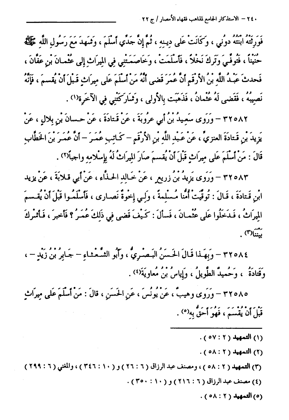 32582 - وَرَوَى سَعِيدُ بْنُ أَبِي عَرُوبَةَ، عَنْ قَتَادَةَ، عَنْ حَسَّانَ بْنِ بِلَالٍ، عَنْ يَزِيدَ بْنِ قَتَادَةَ الْعَنْزِيِّ، عَنْ عَبْدِ اللَّهِ بْنِ الْأَرْقَمِ - كَاتِبِ عُمَرَ - أَنَّ عُمَرَ بْنَ الْخَطَّابِ قَالَ: مَنْ أَسْلَمَ عَلَى مِيرَاثٍ قَبْلَ أَنْ يُقْسَمَ صَارَ الْمِيرَاثُ لَهُ بِإِسْلَامِهِ وَاجِبًا.