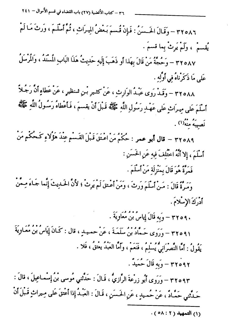 32586 - وَقَالَ الْحَسَنُ: فَإِنْ قَسَمَ بَعْضَ الْمِيرَاثِ، ثُمَّ أَسْلَمَ، وَرِثَ مَا لَمْ يُقْسَمْ، وَلَمْ يَرِثْ بِمَا قَسَمَ.
