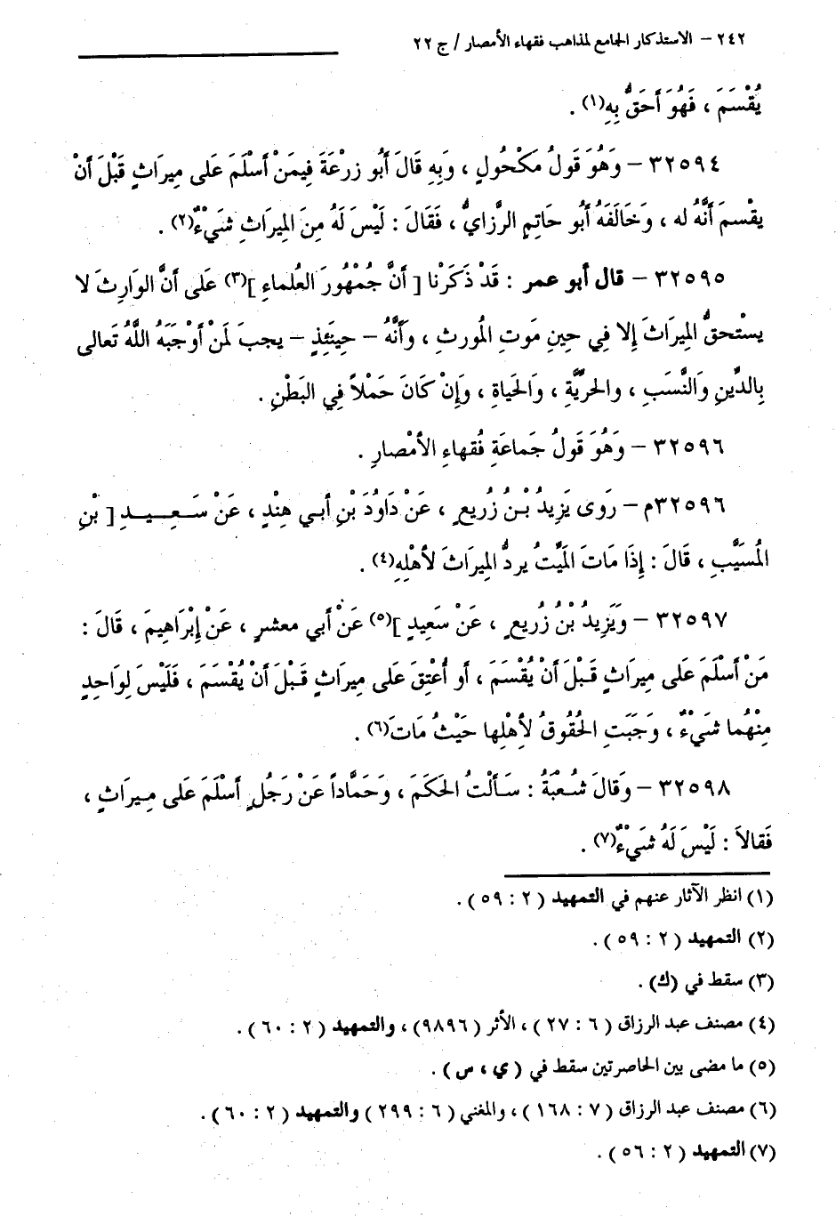 32597 - وَيَزِيدُ بْنُ زُرَيْعٍ، عَنْ سَعِيدٍ عَنْ أَبِي مَعْشَرٍ، عَنْ إِبْرَاهِيمَ، قَالَ: إِنْ أَسْلَمَ عَلَى مِيرَاثٍ قَبْلَ أَنْ يُقْسَمَ، أَوْ أُعْتِقَ عَلَى مِيرَاثٍ قَبْلَ أَنْ يُقْسَمَ، فَلَيْسَ لِوَاحِدٍ مِنْهُمَا شَيْءٌ، وَجَبَتِ الْحُقُوقُ لِأَهْلِهَا حَيْثُ مَاتَ.