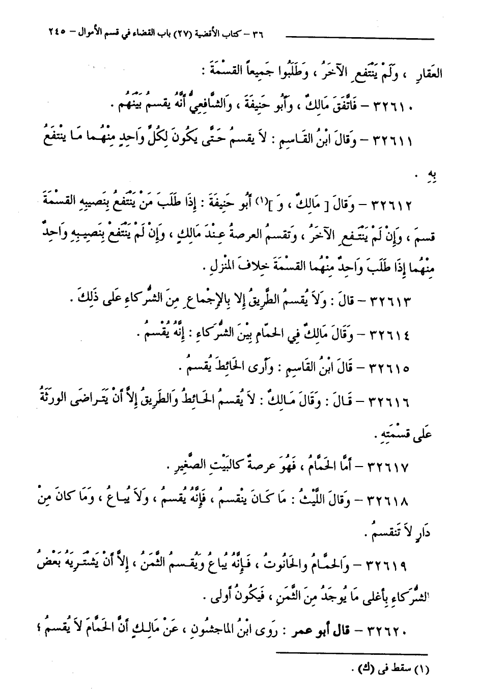 32614 - وَقَالَ مَالِكٌ فِي الْحَمَّامِ بَيْنَ الشُّرَكَاءِ: إِنَّهُ يُقْسَمُ.