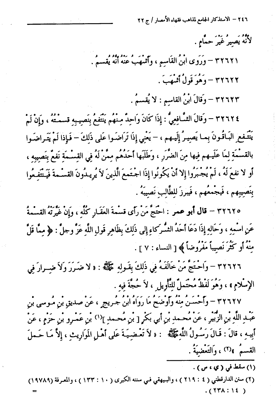 32625 - قَالَ أَبُو عُمَرَ: احْتَجَّ مَنْ رَأَى قِسْمَةَ الْعَقَارِ كُلِّهِ، وَإِنْ غَيَّرَتْهُ الْقِسْمَةُ عَنِ اسْمِهِ، وَحَالِهِ إِذَا دَعَا أَحَدُ الشُّرَكَاءِ إِلَى ذَلِكَ بِظَاهِرِ قَوْلِ اللَّهِ عَزَّ وَجَلَّ:مِمَّا قَلَّ مِنْهُ أَوْ كَثُرَ نَصِيبًا مَفْرُوضًا [ النِّسَاءِ: 7 ].