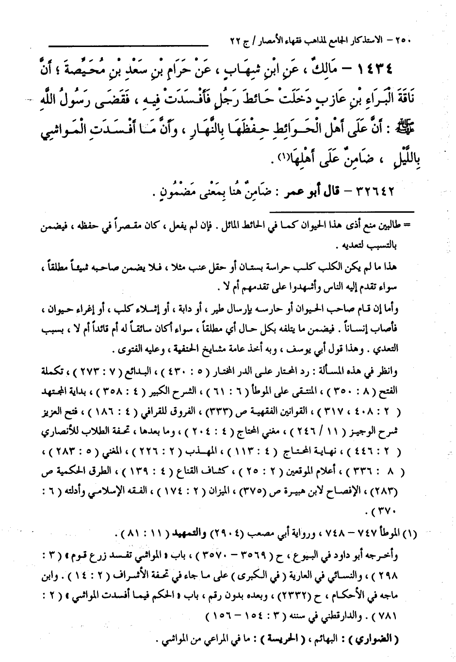 1434 - مَالِكٌ، عَنِ ابْنِ شِهَابٍ، عَنْ حَرَامِ بْنِ سَعْدِ بْنِ مُحَيِّصَةَ ;أَنَّ نَاقَةَ الْبَرَاءِ بْنِ عَازِبٍ دَخَلَتْ حَائِطَ رَجُلٍ فَأَفْسَدَتْ فِيهِ، فَقَضَى رَسُولُ اللَّهِ - صَلَّى اللَّهُ عَلَيْهِ وَسَلَّمَ -: أَنَّ عَلَى أَهْلَ الْحَوَائِطِ حِفْظَهَا بِالنَّهَارِ، وَأَنَّ مَا أَفْسَدَتِ الْمَوَاشِي بِاللَّيْلِ، ضَامِنٌ عَلَى أَهْلِهَا.