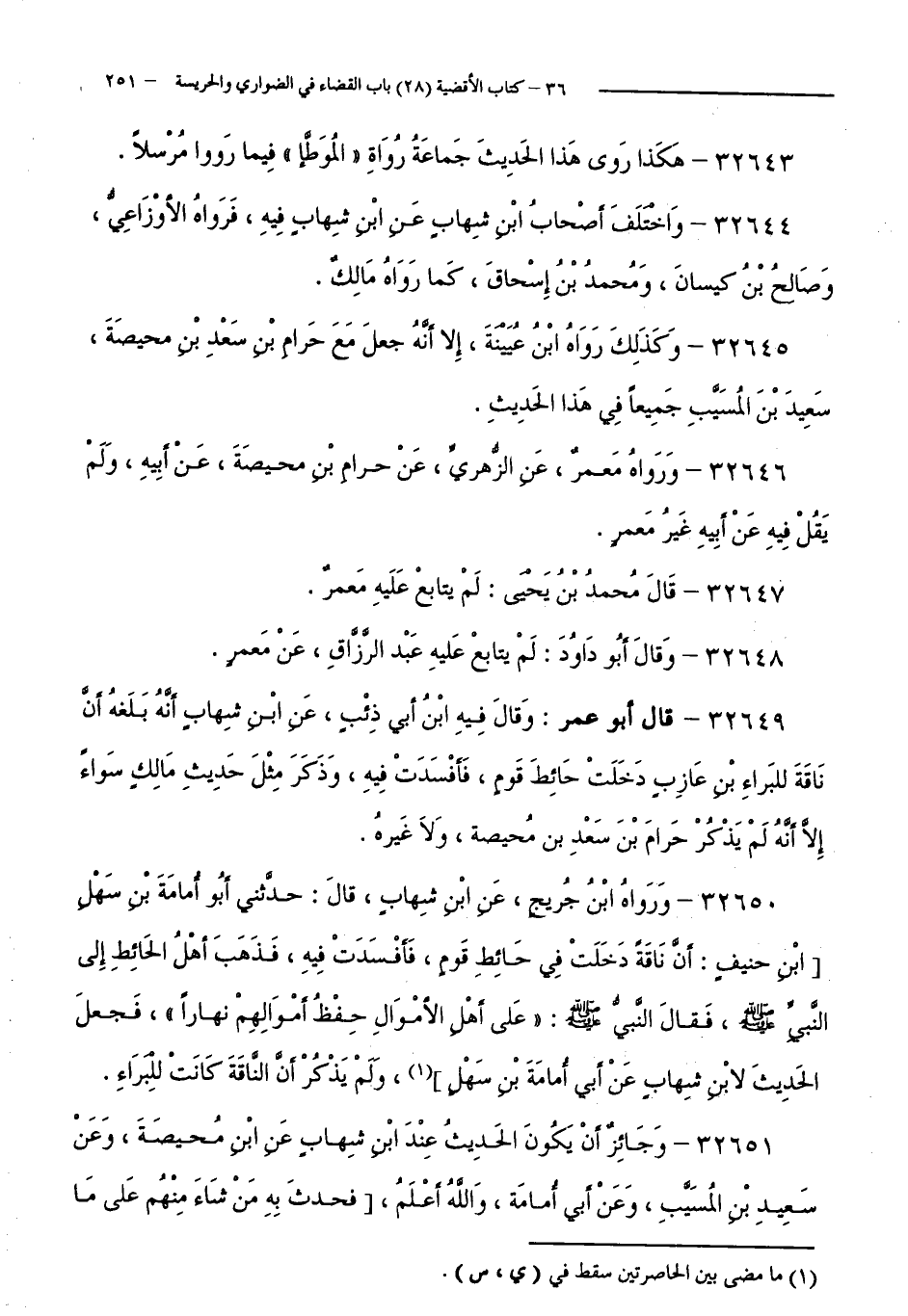 32650 - وَرَوَاهُ ابْنُ جُرَيْجٍ، عَنِ ابْنِ شِهَابٍ، قَالَ: حَدَّثَنِي أَبُو أُمَامَةَ بْنُ سَهْلِ بْنِ حُنَيْفٍ:أَنَّ نَاقَةً دَخَلَتْ فِي حَائِطِ قَوْمٍ، فَأَفْسَدَتْ فِيهِ، فَذَهَبَ أَهْلُ الْحَائِطِ إِلَى النَّبِيِّ - صَلَّى اللَّهُ عَلَيْهِ وَسَلَّمَ -، فَقَالَ النَّبِيُّ - صَلَّى اللَّهُ عَلَيْهِ وَسَلَّمَ -: عَلَى أَهْلِ الْأَمْوَالِ حِفْظُ أَمْوَالِهِمْ نَهَارًا، فَجَعَلَ الْحَدِيثَ لِابْنِ شِهَابٍ عَنْ أَبِي أُمَامَةَ بْنِ سَهْلٍ، وَلَمْ يَذْكُرْ أَنَّ النَّاقَةَ كَانَتْ لِلْبَرَاءِ.
