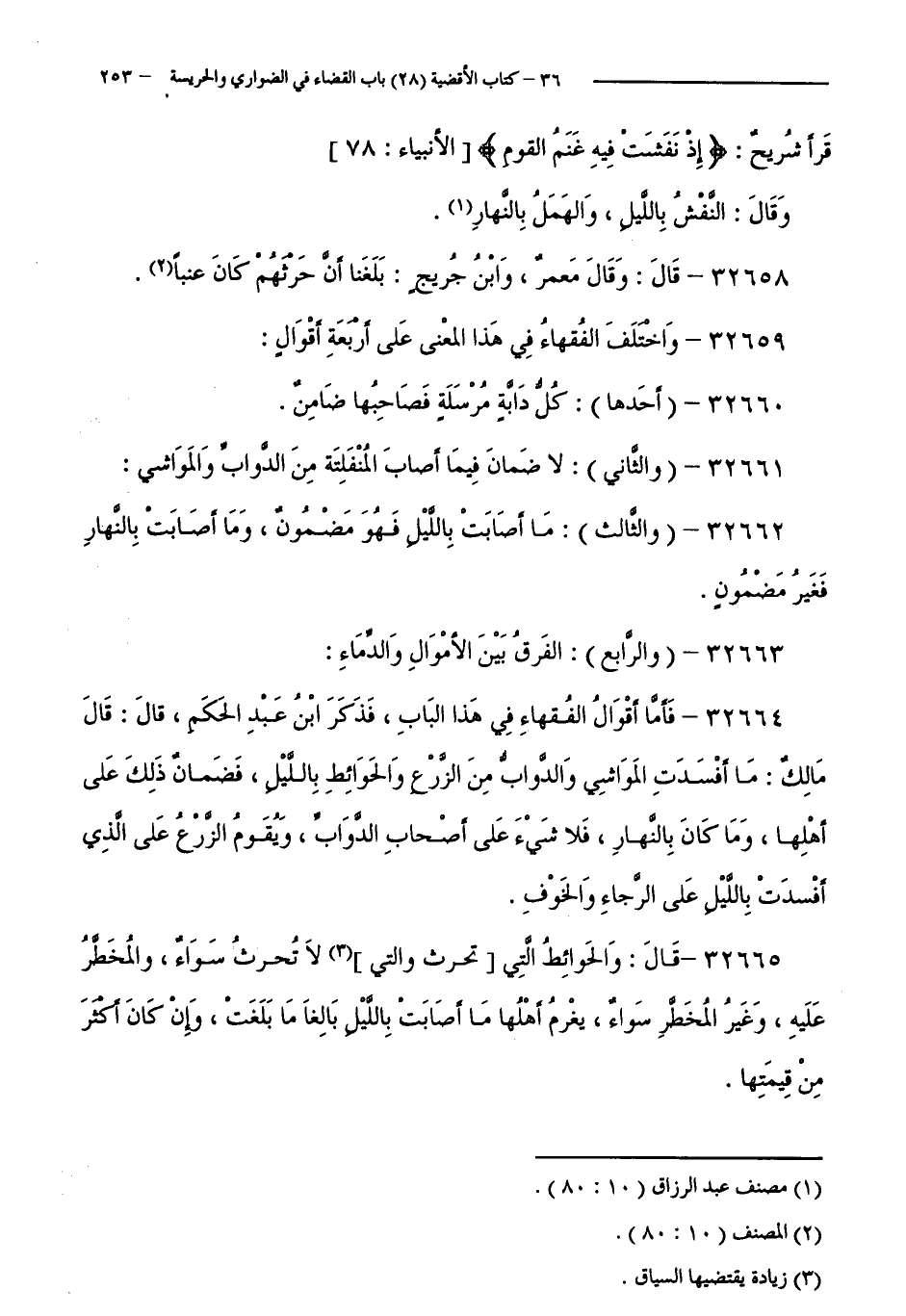32662 - وَالثَّالِثُ: مَا أَصَابَتْ بِاللَّيْلِ فَهُوَ مَضْمُونٌ، وَمَا أَصَابَتْ بِالنَّهَارِ فَغَيْرُ مَضْمُونٍ.
