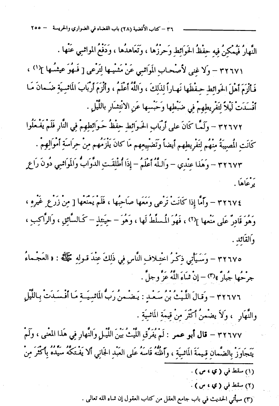 32671 - وَلَا غِنَى لِأَصْحَابِ الْمَوَاشِي عَنْ مَشْيِهَا لِتَرْعَى ؛ فَهُوَ عَيْشُهَا، فَأُلْزِمَ أَهْلُ الْحَوَائِطِ حِفْظَهَا نَهَارًا لِذَلِكَ، وَاللَّهُ أَعْلَمُ، وَأُلْزِمُ أَرْبَابُ الْمَاشِيَةِ ضَمَانَ مَا أَفْسَدَتْ لَيْلًا لِتَفْرِيطِهِمْ فِي ضَبْطِهَا وَحَبْسِهَا عَنِ الِانْتِشَارِ بِاللَّيْلِ.