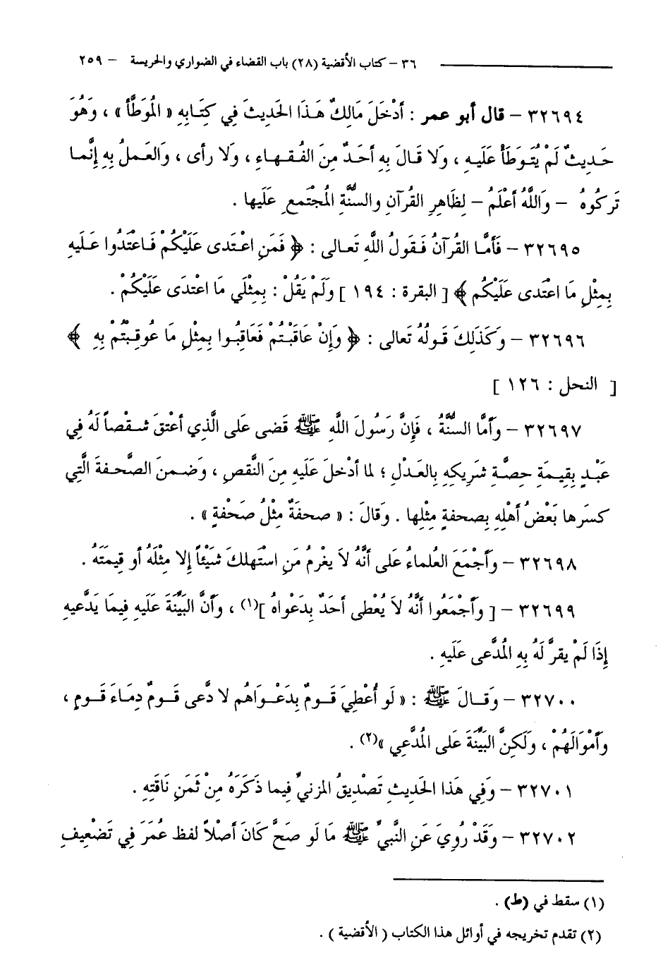 32697 - وَأَمَّا السُّنَّةُ،فَإِنَّ رَسُولَ اللَّهِ - صَلَّى اللَّهُ عَلَيْهِ وَسَلَّمَ - قَضَى عَلَى الَّذِي أَعْتَقَ شِقْصًا لَهُ فِي عَبْدٍ بِقِيمَةِ حِصَّةِ شَرِيكِهِ بِالْعَدْلِ; لِمَا أَدْخَلَ عَلَيْهِ مِنَ النَّقْصِ، وَضِمِنَ الصَّحْفَةَ الَّتِي كَسَرَهَا بَعْضُ أَهْلِهِ بِصَحْفَةٍ مِثْلِهَا. وَقَالَ: صَحْفَةٌ مِثْلُ صَحْفَةٍ.