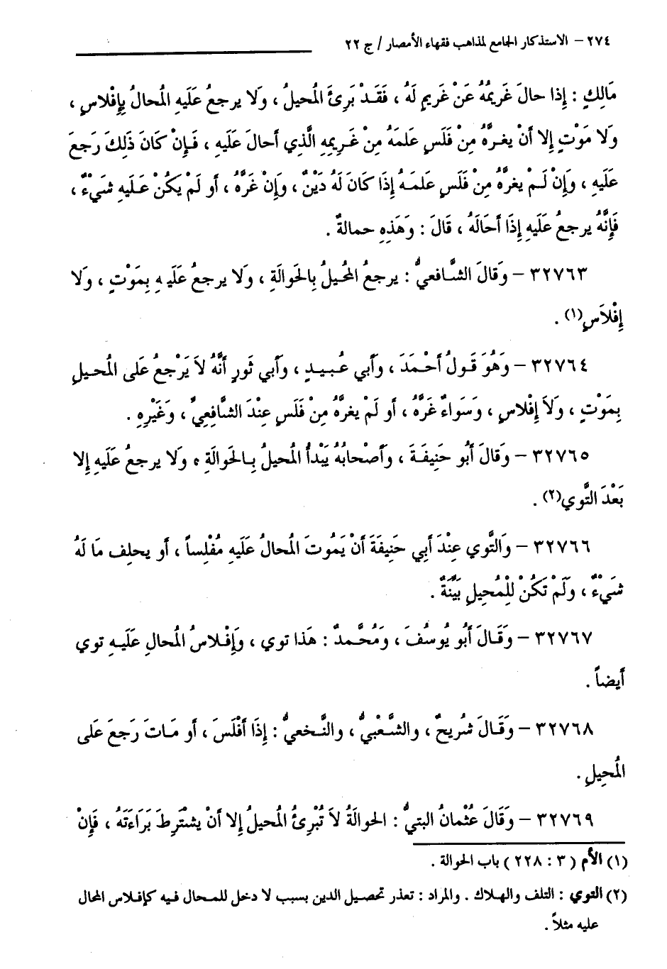 32763 - وَقَالَ الشَّافِعِيُّ: يَرْجِعُ الْمُحِيلُ بِالْحَوَالَةِ، وَلَا يَرْجِعُ عَلَيْهِ بِمَوْتٍ، وَلَا إِفْلَاسٍ.