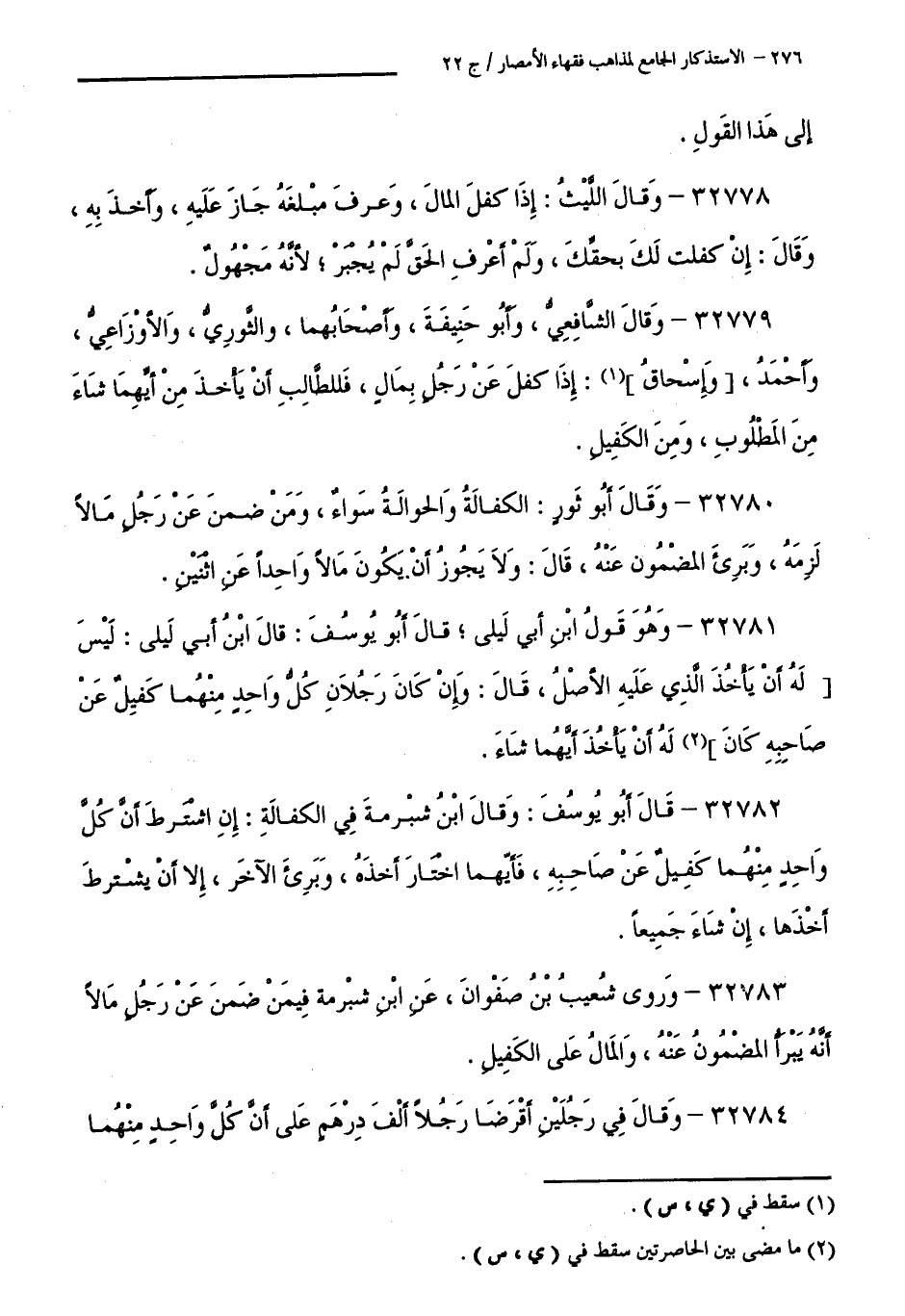 32779 - وَقَالَ الشَّافِعِيُّ، وَأَبُو حَنِيفَةَ، وَأَصْحَابُهُمَا، وَالثَّوْرِيُّ، وَالْأَوْزَاعِيُّ، وَأَحْمَدُ، وَإِسْحَاقُ: إِذَا كَفَلَ عَنْ رَجُلٍ بِمَالٍ، فَلِلطَّالِبِ أَنْ يَأْخُذَ مِنْ أَيِّهِمَا شَاءَ مِنَ الْمَطْلُوبِ، وَمِنَ الْكَفِيلِ.