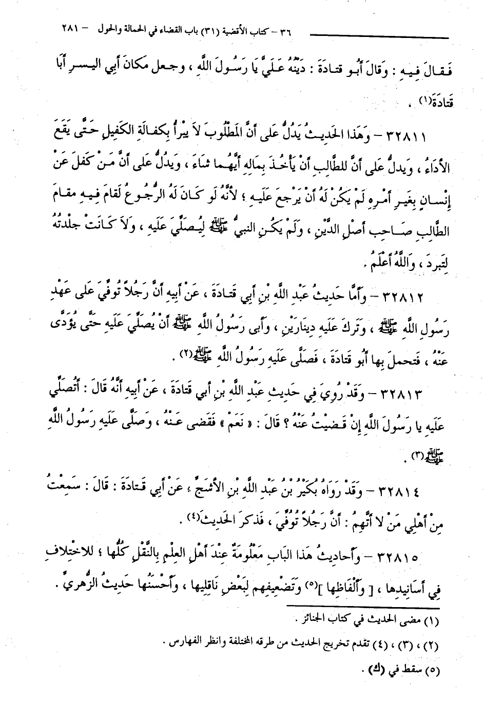 32812 - وَأَمَّا حَدِيثُ عَبْدِ اللَّهِ بْنِ أَبِي قَتَادَةَ، عَنْ أَبِيهِأَنَّ رَجُلًا تُوُفِّيَ عَلَى عَهْدِ رَسُولِ اللَّهِ - صَلَّى اللَّهُ عَلَيْهِ وَسَلَّمَ -، وَتَرَكَ عَلَيْهِ دِينَارَيْنِ، وَأَبَى رَسُولُ اللَّهِ - صَلَّى اللَّهُ عَلَيْهِ وَسَلَّمَ - أَنْ يُصَلِّيَ عَلَيْهِ حَتَّى يُؤَدَّى عَنْهُ، فَتَحَمَّلَ بِهَا أَبُو قَتَادَةَ، فَصَلَّى عَلَيْهِ رَسُولُ اللَّهِ - صَلَّى اللَّهُ عَلَيْهِ وَسَلَّمَ -.