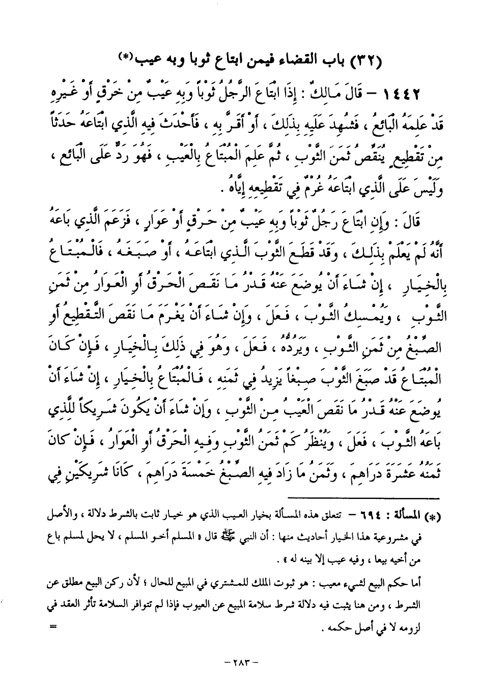 1442 - قَالَ مَالِكٌ: إِذَا ابْتَاعَ الرَّجُلُ ثَوْبًا وَبِهِ عَيْبٌ مِنْ خَرْقٍ أَوْ غَيْرِهِ قَدْ عَلِمَهُ الْبَائِعُ، فَشَهِدَ عَلَيْهِ بِذَلِكَ، أَوْ أَقَرَّ بِهِ، فَأَحْدَثَ فِيهِ الَّذِي ابْتَاعَهُ حَدَثًا مِنْ تَقْطِيعٍ يَنْقُصُ ثَمَنُ الثَّوْبِ، ثُمَّ عَلِمَ الْمُبْتَاعُ بِالْعَيْبِ، فَهُوَ رَدٌّ عَلَى الْبَائِعِ، وَلَيْسَ عَلَى الَّذِي ابْتَاعَهُ غُرْمٌ فِي تَقْطِيعِهِ إِيَّاهُ.