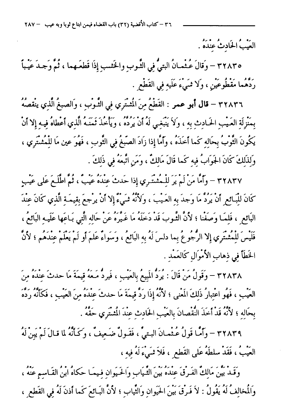 32835 - وَقَالَ عُثْمَانُ الْبَتِّيُّ فِي الثَّوْبِ وَالْخَشَبِ إِذَا قَطَعَهُمَا، ثُمَّ وَجَدَ عَيْبًا رَدَّهُمَا مَقْطُوعَيْنِ، وَلَا شَيْءَ عَلَيْهِ فِي الْقَطْعِ.