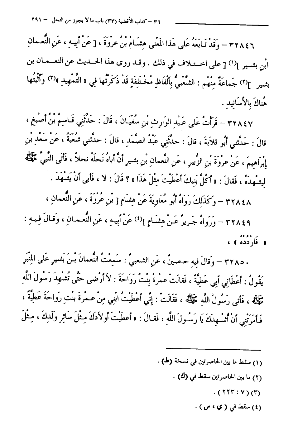 32846 - وَقَدْ تَابَعَهُ عَلَى هَذَا الْمَعْنَى هِشَامُ بْنُ عُرْوَةَ، عَنْ أَبِيهِ، عَنِ النُّعْمَانِ بْنِ بَشِيرٍ عَلَى اخْتِلَافٍ فِي ذَلِكَ. وَقَدْ رَوَى هَذَا الْحَدِيثَ عَنِ النُّعْمَانِ بْنِ بَشِيرٍ جَمَاعَةٌ مِنْهُمُ: الشَّعْبِيُّ بِأَلْفَاظٍ مُخْتَلِفَةٍ قَدْ ذَكَرْتُهَا فِي التَّمْهِيدِ وَأَثْبَتُّهَا هُنَاكَ بِالْأَسَانِيدِ.